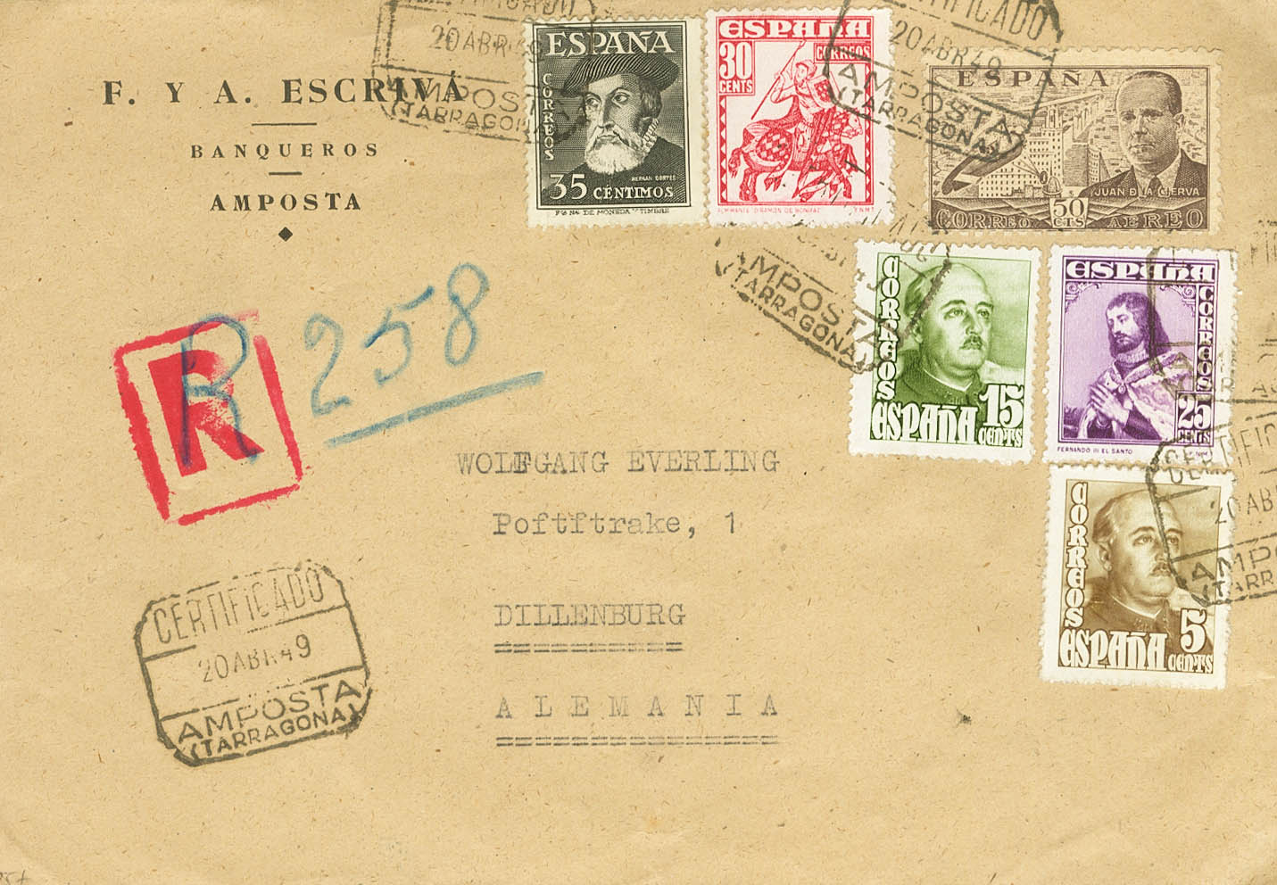 1033/34, 883, 1020/21, 1035. 1949. Serie completa y diversos valores. Certificado de AMPOSTA (TARRAGONA) a DILLENBURG (ALEMANIA). Al dorso llegada. MAGNIFICA.