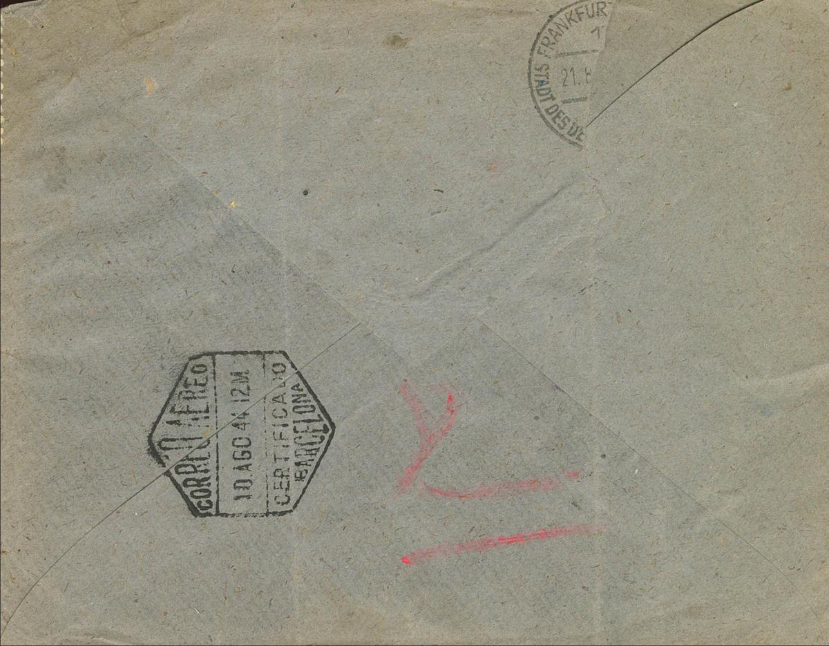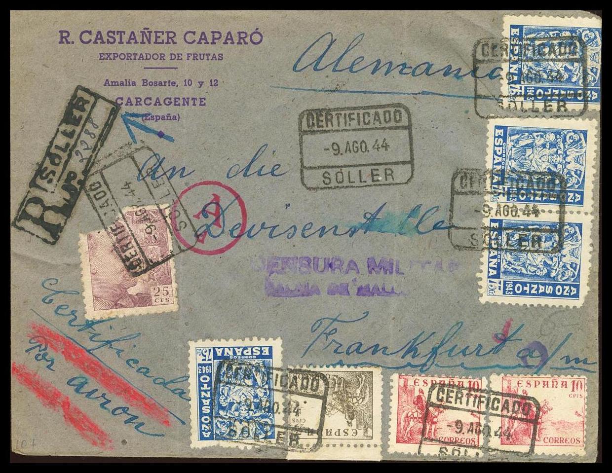 966(4), 916, 917(2), 923. 1944. 75 cts azul, cuatro sellos y diversos valores (uno con defecto de origen). Certificado de SOLLER (BALEARES) a FRANKFURT (ALEMANIA). Al dorso llegada. MAGNIFICA.