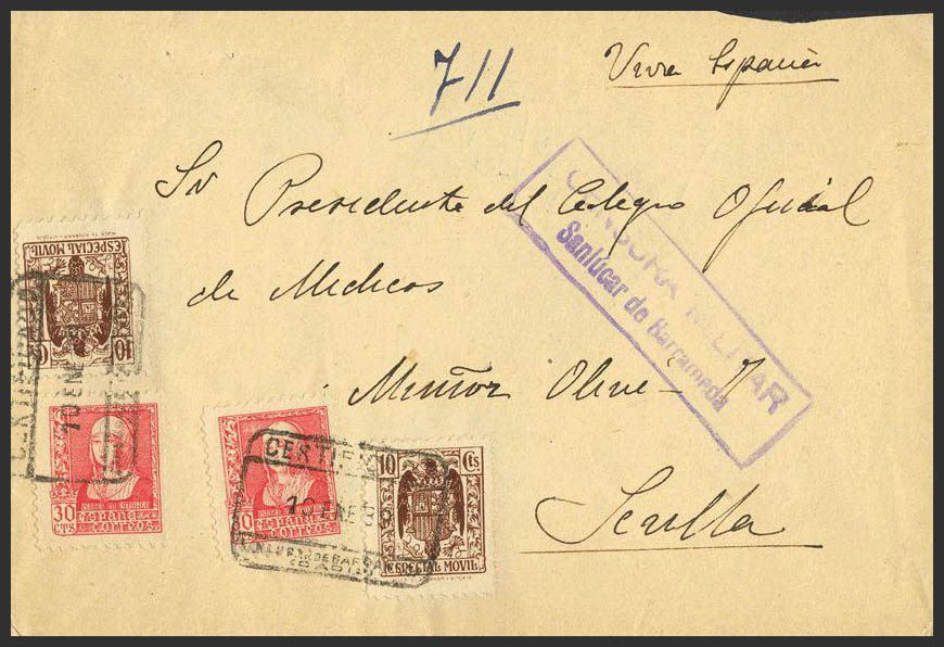 856(2). 1939. 10 cts castaño, dos sellos MOVIL y 30 cts rojo dos sellos. SAN LUCAR DE BARRAMEDA a SEVILLA. MAGNIFICA.