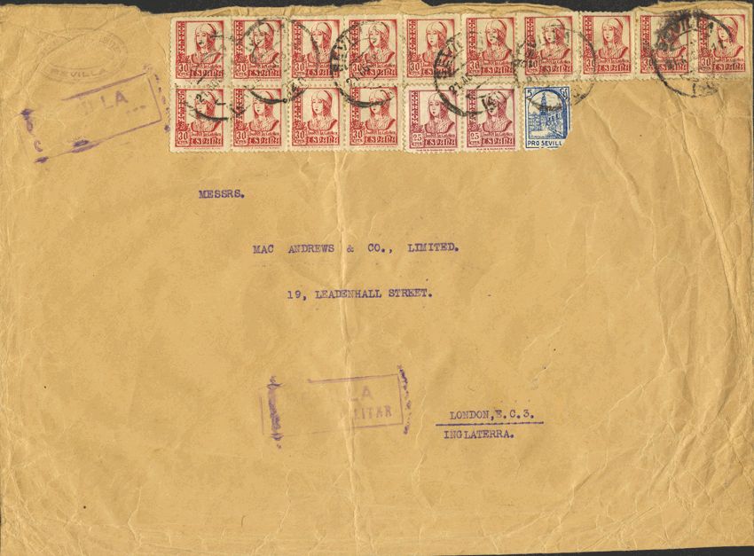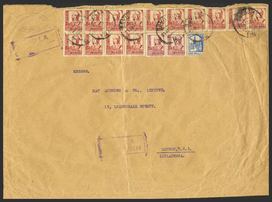 822(2), 823(14). 1937. 25 cts, pareja, 30 cts, catorce sellos y 5 cts sello local SEVILLA. SEVILLA a LONDRES. MAGNIFICA.