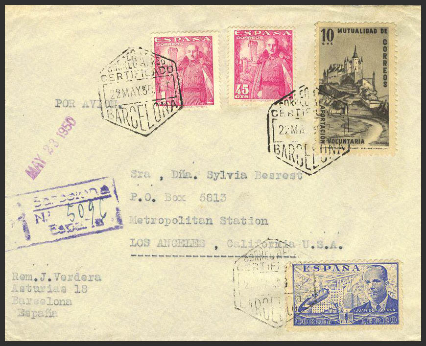 Estado Español Correo Certificado. CORREO AEREO / CERTIFICADO / BARCELONA, al dorso llegada. MAGNIFICO.