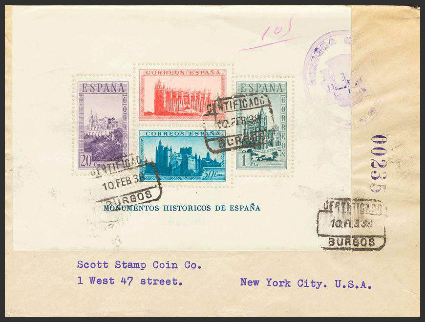 847. 1938. Hoja bloque. BURGOS a NUEVA YORK (USA). Al dorso llegada. MAGNIFICA.