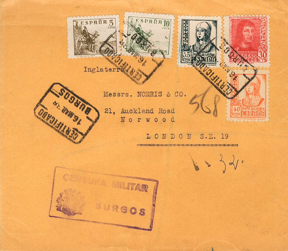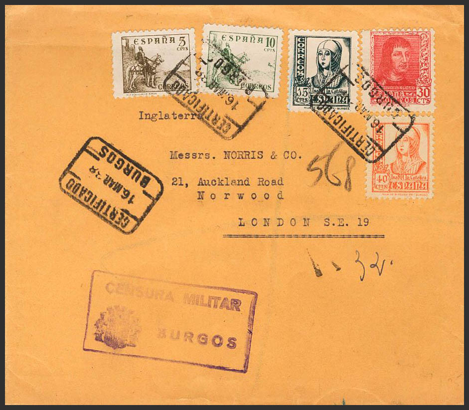 816, 817, 820, 824, 844A. 1938. Diversos valores. Certificado de BURGOS a LONDRES (INGLATERRA). MAGNIFICA.