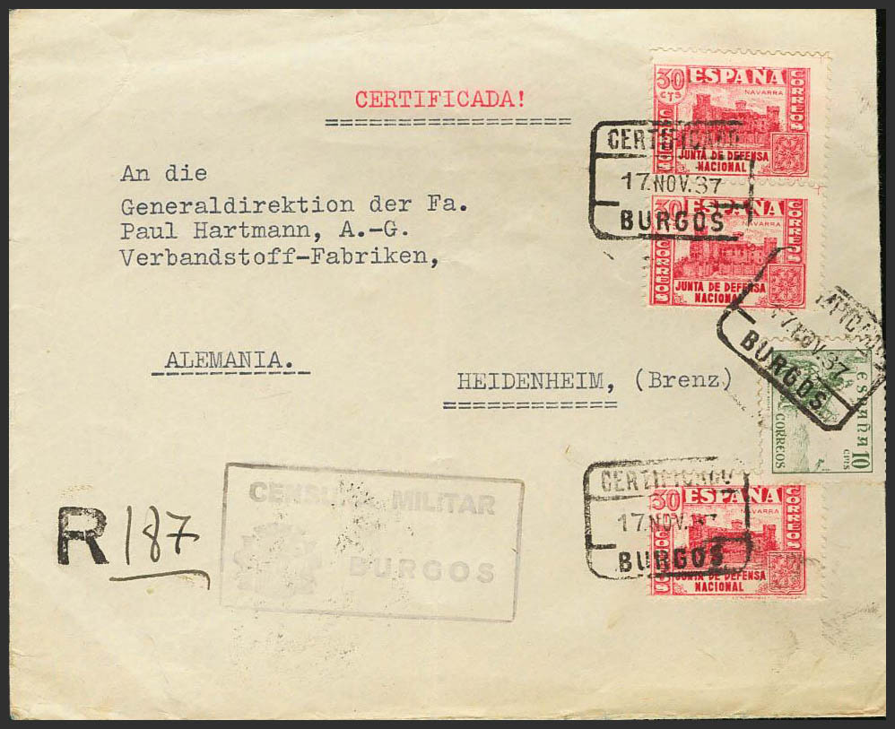 808(3), 817. 1937. 30 cts rosa, tres sellos y 10 cts verde. Certificado de BURGOS a HEIDENHEIM (ALEMANIA). Al dorso llegada. MAGNIFICA.