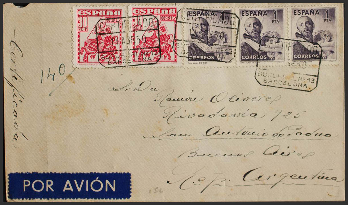 1070(3), 1034(2). 1950. 1 pts violeta, tres sellos y 30 cts rojo, dos sellos. Certificado de BARCELONA a BUENOS AIRES (ARGENTINA). Al dorso llegada. MAGNIFICA.
