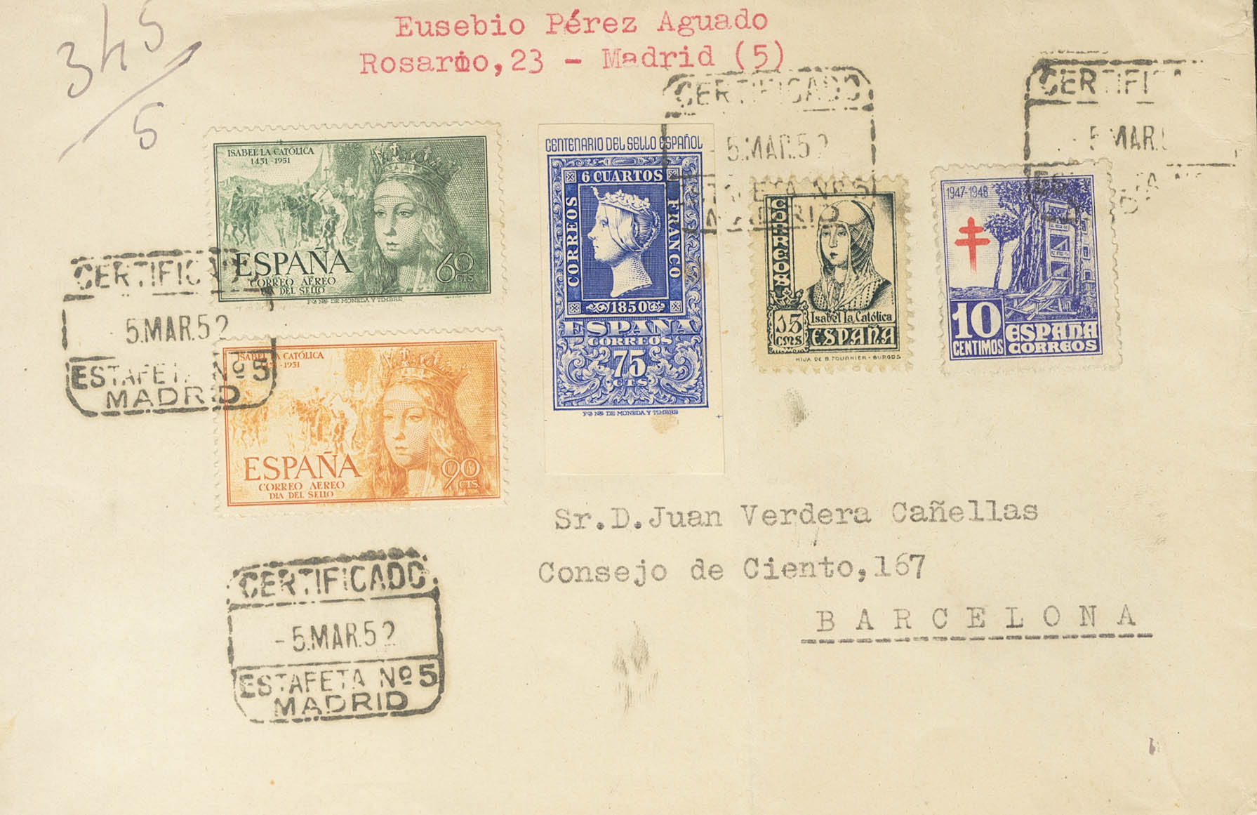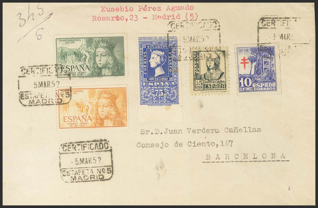 1075, 1097, 1098. 1952. Diversos valores. Carta Certificada de MADRID a BARCELONA. Al dorso llegada. MAGNIFICA Y ESPECTACULAR.