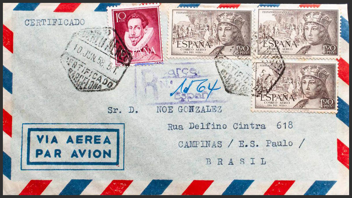 1100(3). 1958. 10 cts y 1´90 pts, tres sellos. Certificado de BARCELONA a SAN PAULO (BRASIL). Al dorso llegada. MAGNIFICA.