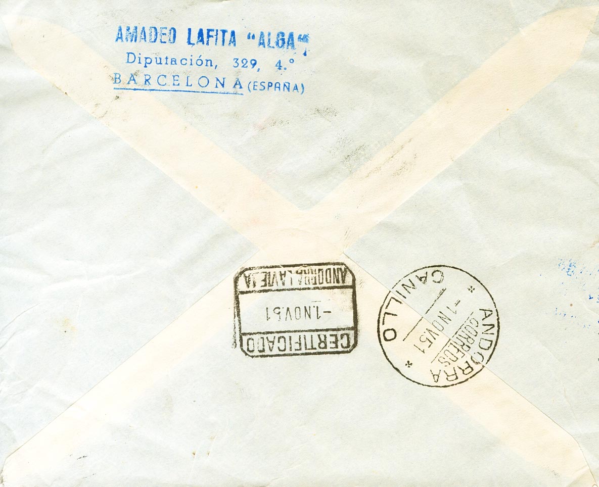 1072, 1045, 1049, 1053. 1951. 10 cts burdeos, 10 cts rosa, 30 cts azul y 50 cts gris. Certificado de BARCELONA a CANILLO (ANDORRA). Al dorso llegada. MAGNIFICA.