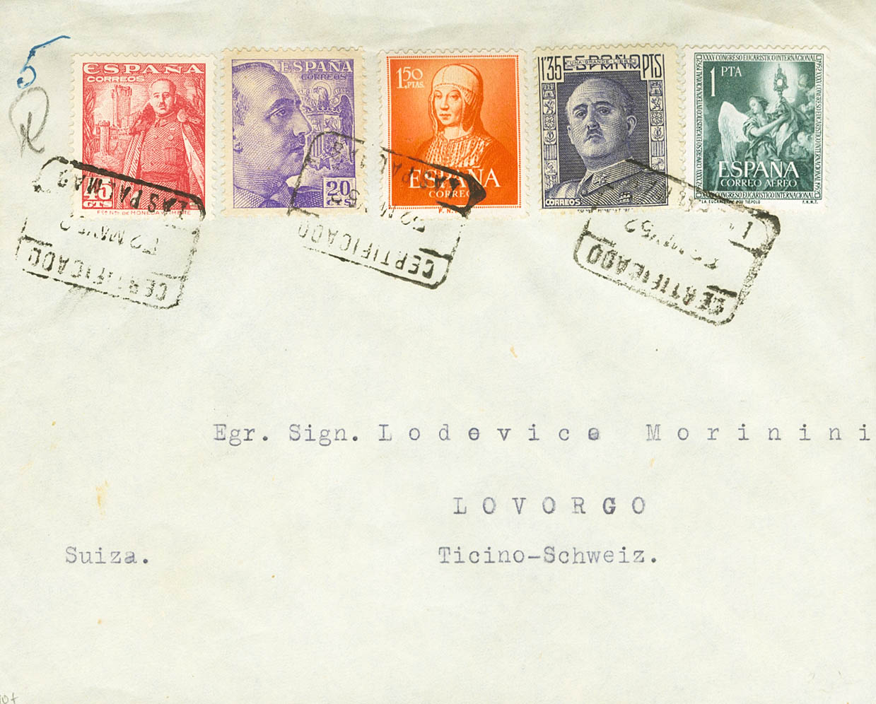 1095, 1117, 1028, 1047, 1061. 1952. 1´90 pts naranja y diversos valores. Certificado de LAS PALMAS DE GRAN CANARIA a LAVORGO (ITALIA). Al dorso llegada. MAGNIFICA.