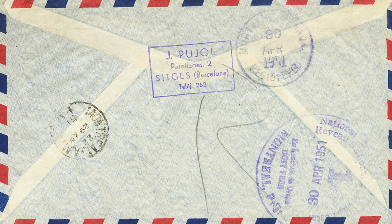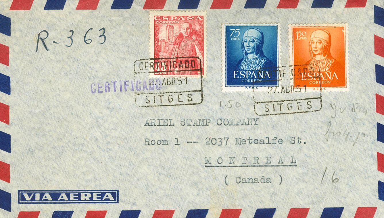 1093, 1095, 1028A. 1951. 75 cts azul, 1´50 pts naranja y 45 cts rosa. Certificado de SITGES (BARCELONA) a MONTREAL (CANADA). Al dorso marca de la aduana de Montreal y llegada. MAGNIFICA Y RARO DESTINO.
