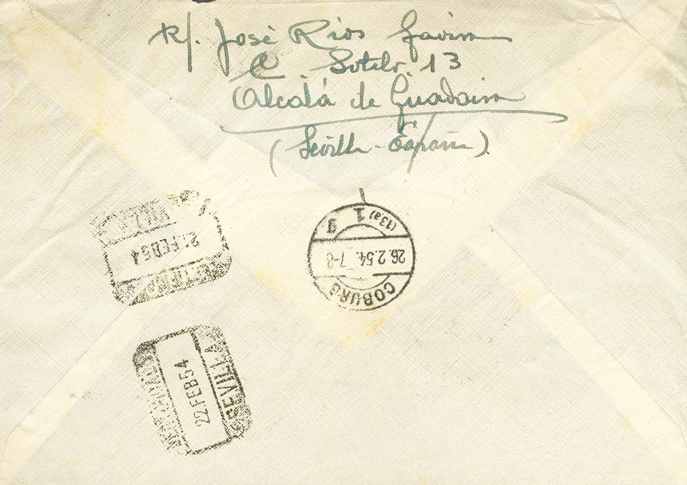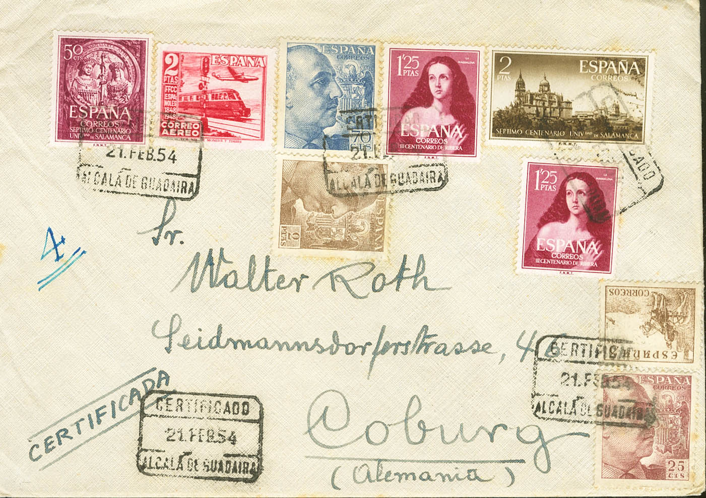 1128. 1954. 2 pts castaño y diversos valores. Certificado de ALCALA DE GUADAIRA (SEVILLA) a COBURGO (ALEMANIA). Al dorso llegada. MAGNIFICA.