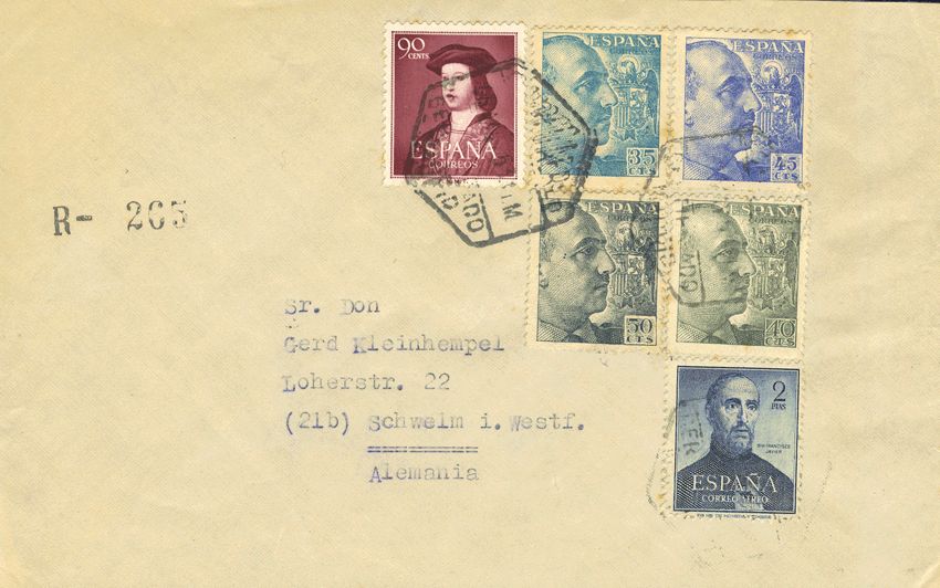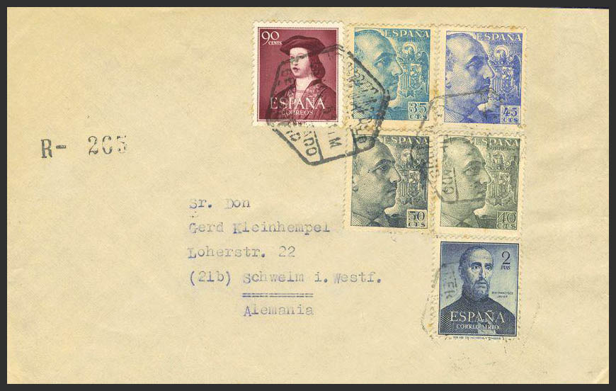 1108, 1118. 1953. 2 pts azul, acompañado de diversos valores. MADRID a ALEMANIA. "POR AVION" al dorso llegada. MAGNIFICA.