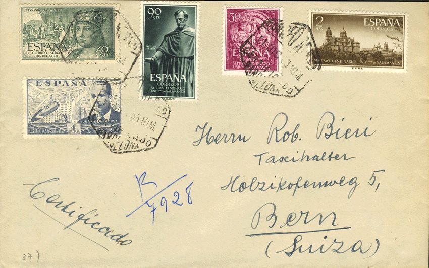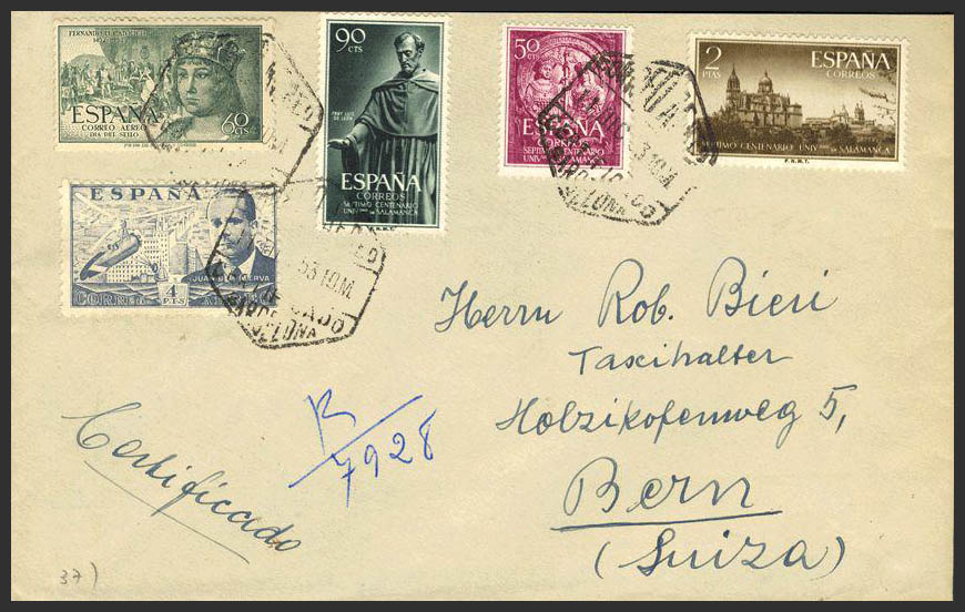 1128. 1953. Diversos valores. Certificado de MADRID a SUIZA. Al dorso llegada. MAGNIFICA Y RARA.