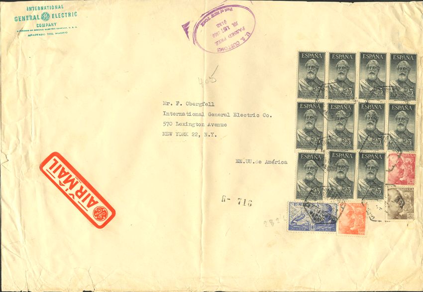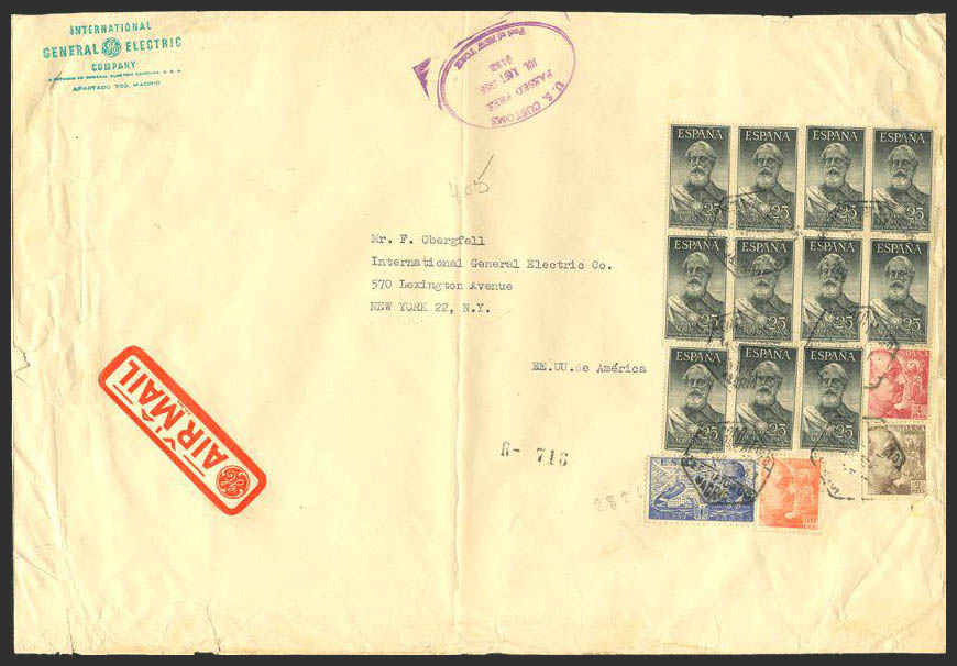 1124(11). 1955. 25 pts verde, once sellos. MADRID a USA. Al dorso llegada, alguna rotura habitual en piezas de este tamaño. MAGNIFICA, RARISIMO Y ESPECTACULAR FRANQUEO.