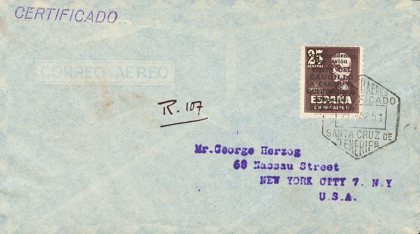 1090. 1951. CAUDILLO A CANARIAS CON NUMERO. SANTA CRUZ DE TENERIFE a NUEVA YORK. Al dorso llegada. MAGNIFICA.