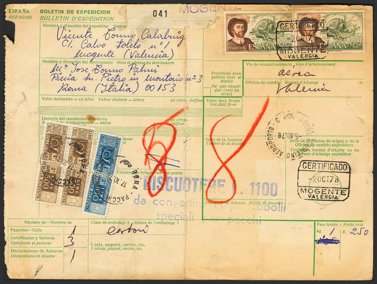 2310(2). 1978. 50 pts castaño y verde, dos sellos. Justificante de Paquete Postal Certificado de MOGENTE (VALENCIA) a ROMA. Tasada a la llegada con dos parejas de tasas de 500 liras castaño y una de 100 liras azul. MAGNIFICO E INUSUAL FRANQUEO MIXTO PARA EL JUSTIFICANTE DE UN PAQUETE POSTAL.