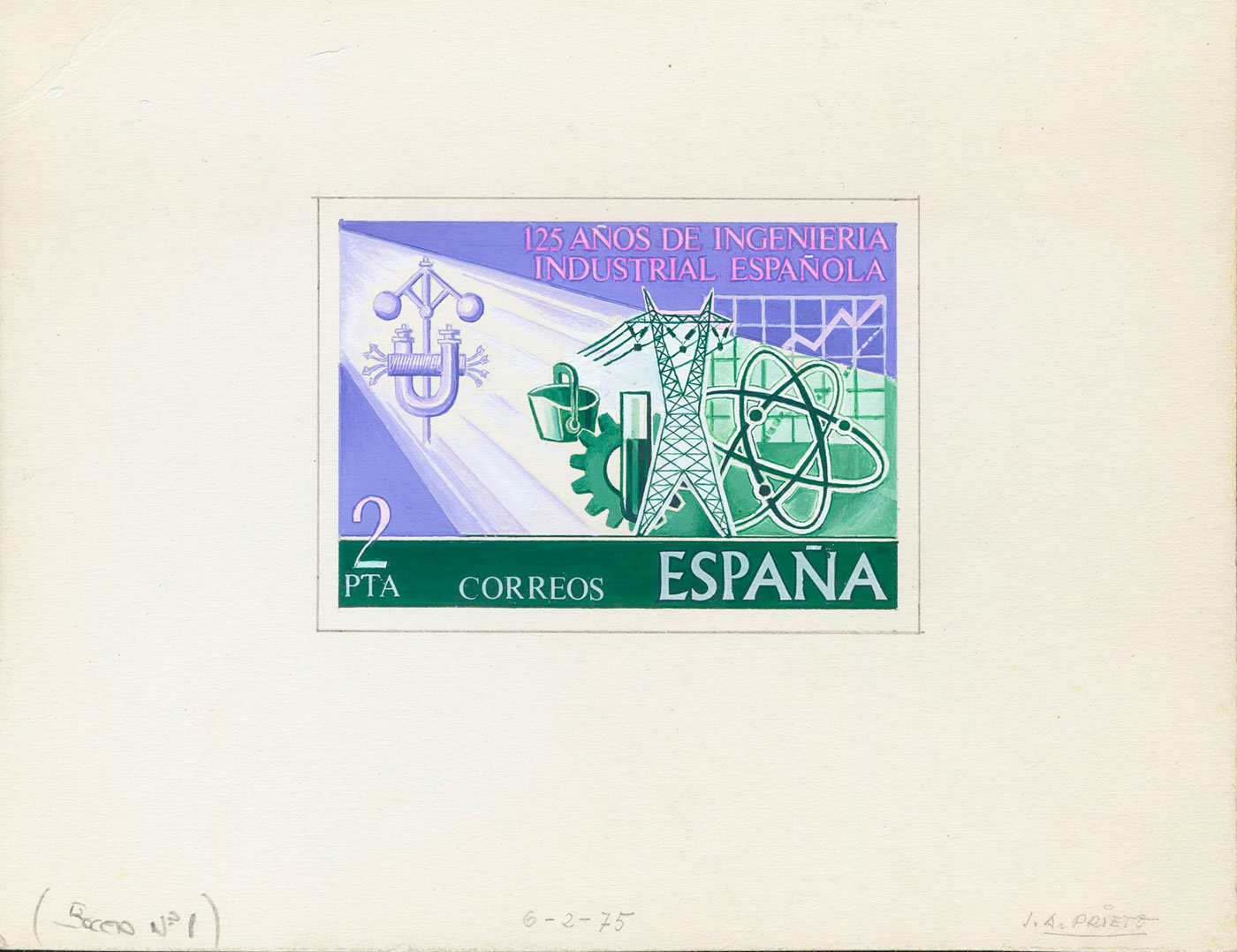 (★) 2292P. 1975. 125 Años de Industrialización Española. Maqueta original del sello de 2 pts (el definitivo tiene un facial de 3 pts), con colores y diseño no adoptados, realizada en acuarela a dos colores por el dibujante de la Casa de la Moneda José Antonio Prieto. MAGNIFICA Y PIEZA UNICA. Cert. COMEX.