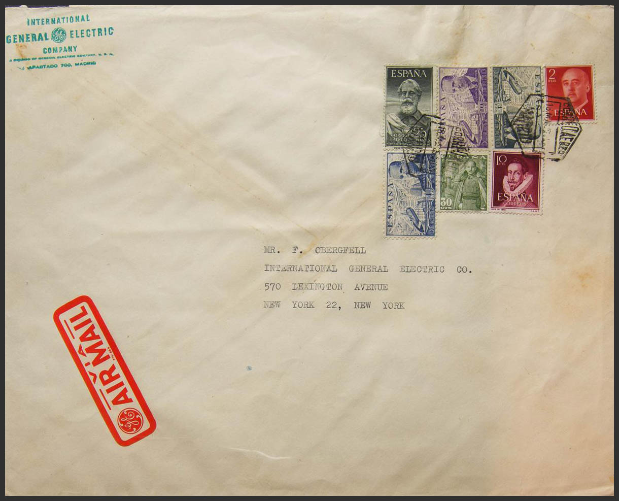 1124, 946(2), 947, 1025, 1072. 1955. 25 pts verde y diversos valores. Correo Aéreo de MADRID a NUEVA YORK. MAGNIFICA Y RARA.