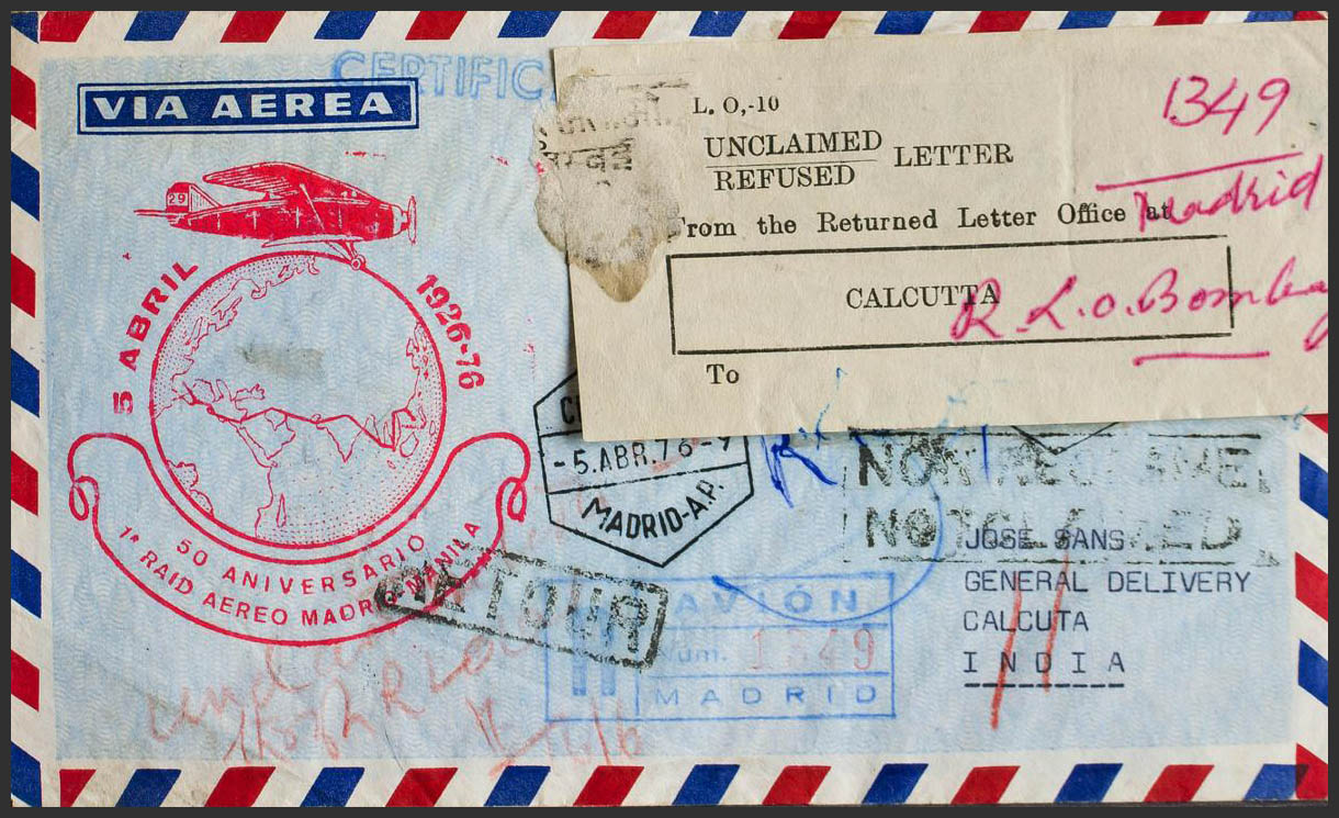 2228, 2119. 1976. 20 pts granate y 15 pts verde. Correo Aéreo Certificado de MADRID a CALCUTA (INDIA). En el frente marca 50 ANIVERSARIO / 1º RAID AEREO MADRID-MANILA, en rojo y devuelta al remitente aplicando etiqueta sobre los sellos UNCLAIMED / REFUSED LETTER y al dorso llegada. MAGNIFICA Y RARA.
