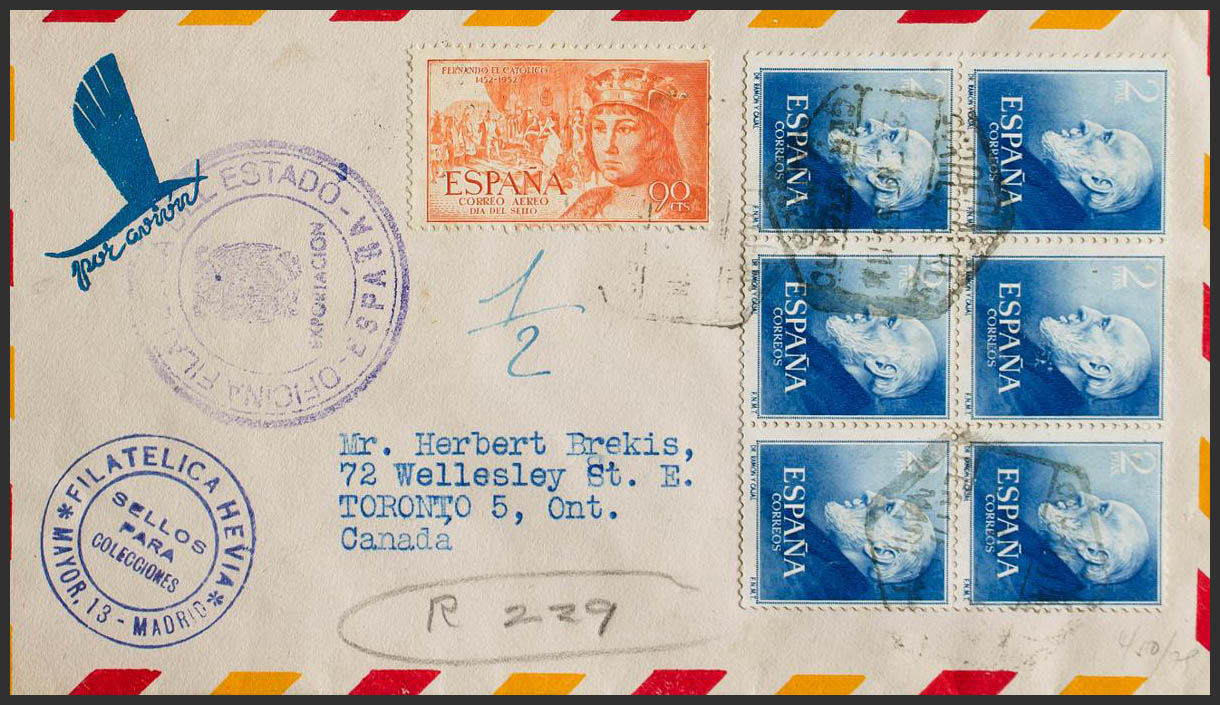 1119(6), 1112. 1953. 2 pts azul, bloque de seis y 90 cts naranja. Certificado de MADRID a TORONTO (CANADA). Al dorso llegada. MAGNIFICA.