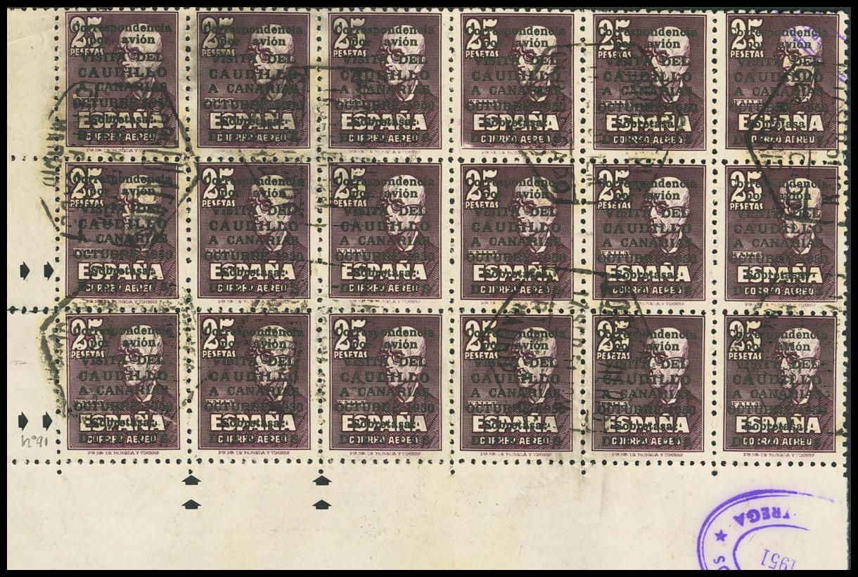 1090(18). 1951. 10 cts sobre 25 pts, bloque de dieciocho, esquina de pliego. CAUDILLO A CANARIAS CON NUMERO. Matasello CORREO AEREO / CERTIFICADO / MADRID. MAGNIFICO Y RARISIMO BLOQUE, SIN DUDA EL MAS GRANDE CONOCIDO EN USADO. Edifil 2009: +++7.830 Euros