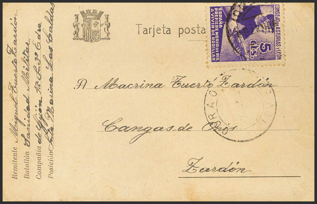 2. 1937. 5 cts violeta. Tarjeta Postal de Campaña de LAS CALDAS a ZARDON. MAGNIFICA.