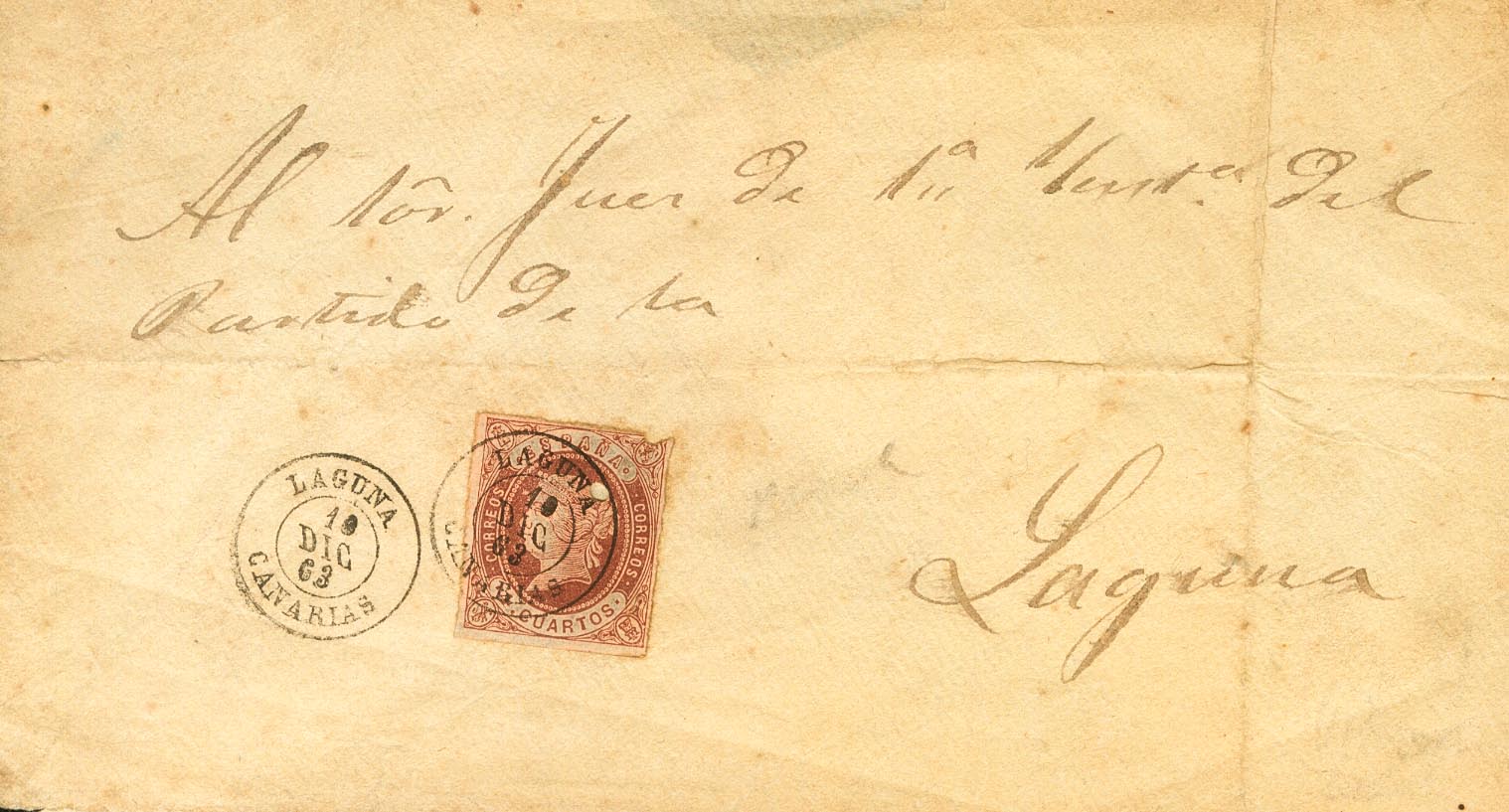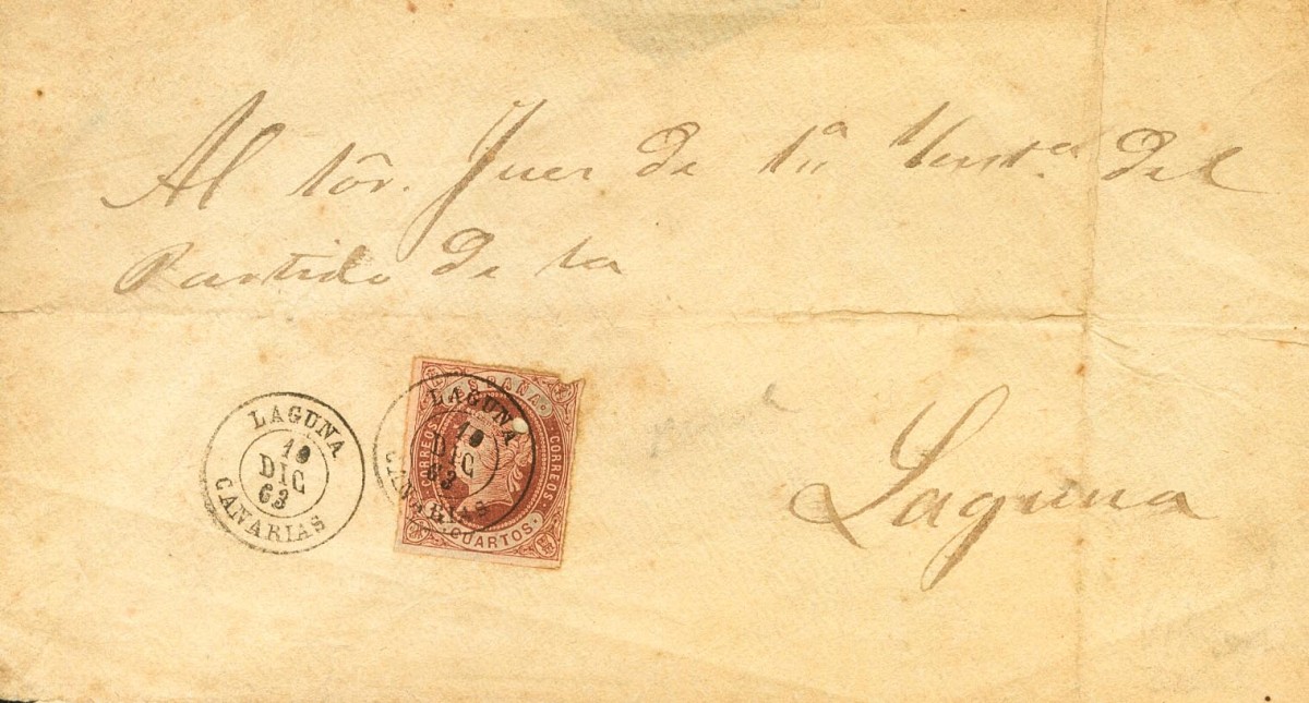 58. 1863. 4 cuartos castaño (sello con defecto, que no desmerece la rareza de la carta). Carta dirigida a LA LAGUNA. Matasello LAGUNA / CANARIAS. MAGNIFICA Y RARISIMA.