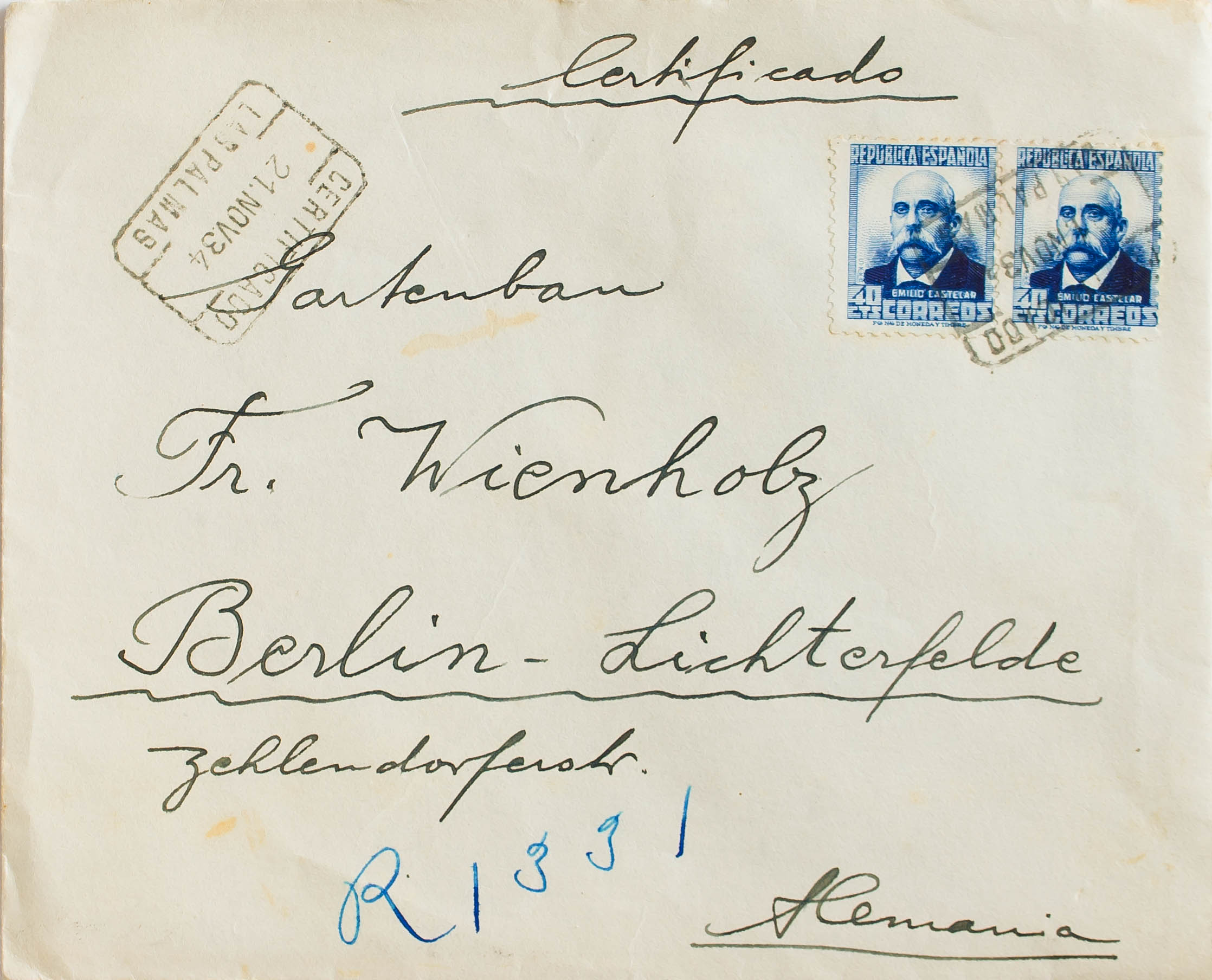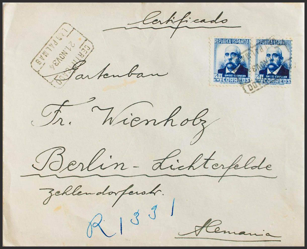 Canarias. Historia Postal. CERTIFICADO / LAS PALMAS, al dorso llegada. MAGNIFICA.