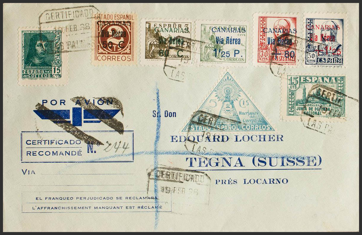 44/46, 50/51, Ben. 20. 1938. Diversos valores. Carta Aérea Certificada de LAS PALMAS a TEGNA (SUIZA). Al dorso llegada. MAGNIFICA.
