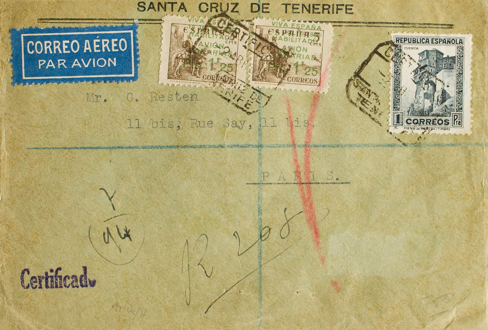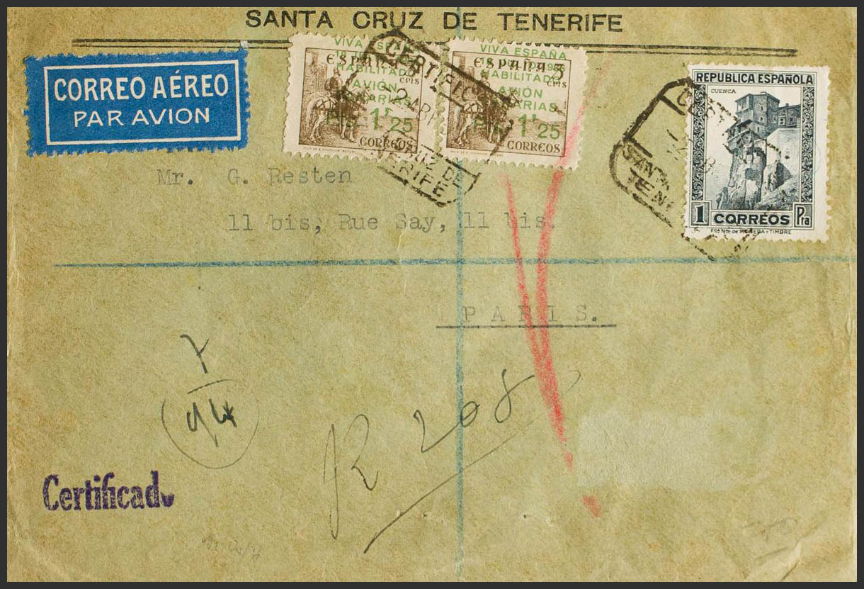 10(2). 1937. 1 pts, 1´25 pts sobre 5 cts, dos sellos. Carta Aérea Certificada de SANTA CRUZ DE TENERIFE a PARIS. Al dorso llegada. MAGNIFICA.
