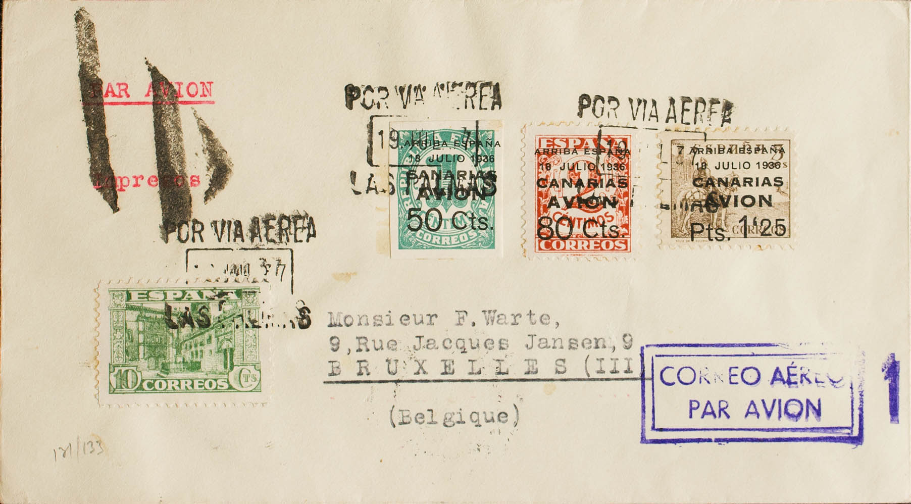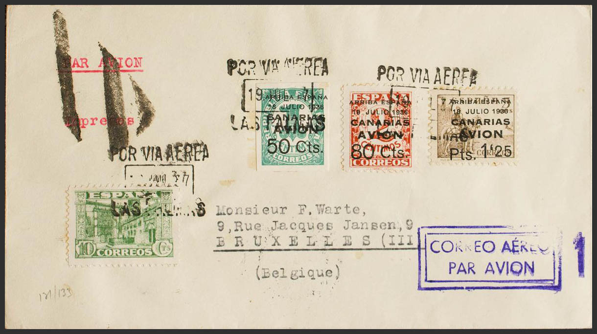 20/22. 1937. Serie completa. LAS PALMAS a BRUSELAS. Al dorso llegada. MAGNIFICA.