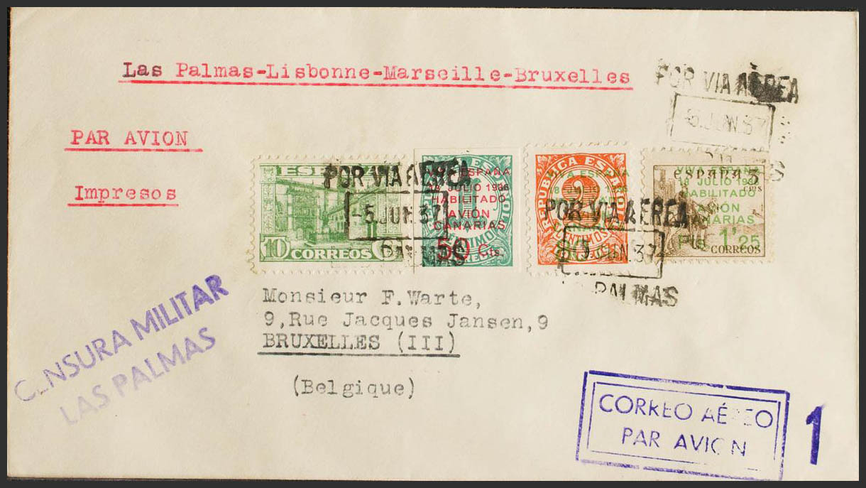8/10. 1937. Serie completa. LAS PALMAS a BRUSELAS. Al dorso llegada. MAGNIFICA