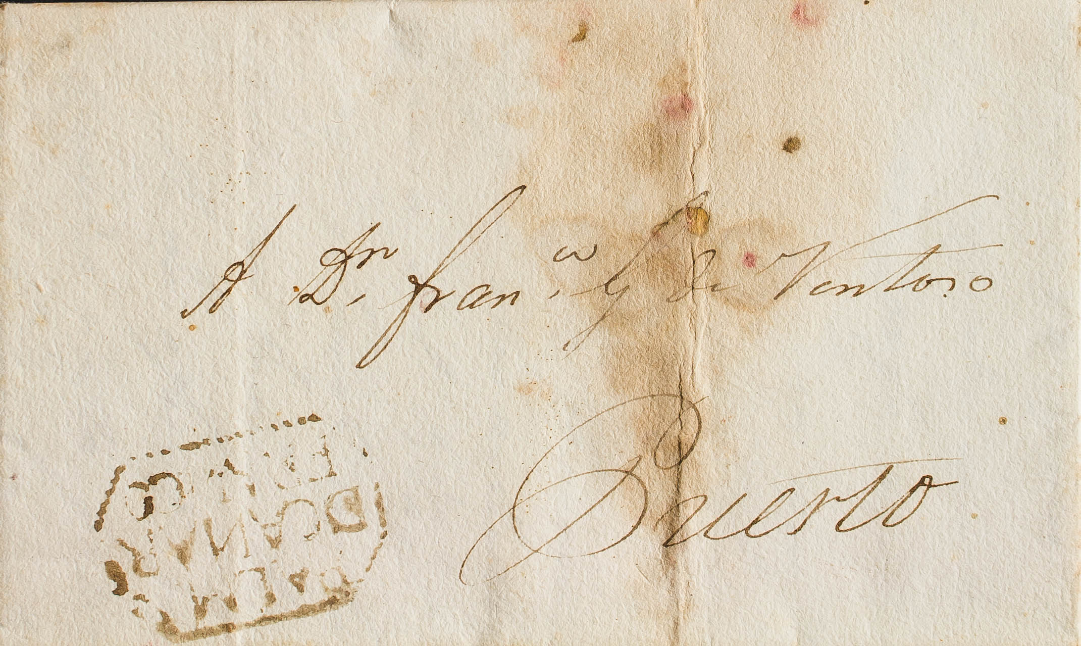 1833. SANTA CRUZ DE LA PALMA a PUERTO DE LA OROTAVA (mancha de humedad en el frente). Marca PALMA / DE CANARS / FRANCO, en tinta de escribir (P.E.1) edición 2004. BONITA Y RARA.