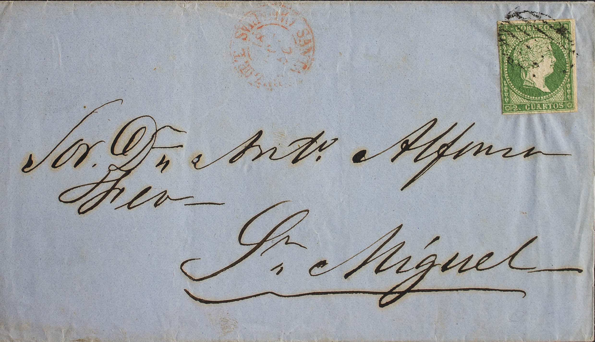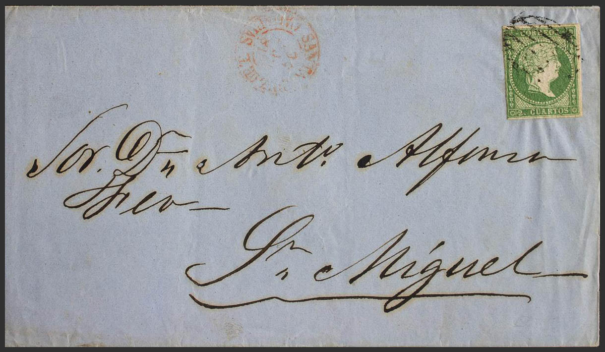 43. 1856. 2 cuartos verde. SANTA CRUZ DE TENERIFE a SAN MIGUEL. MAGNIFICA Y RARA. Edifil 2017: 1.170 Euros