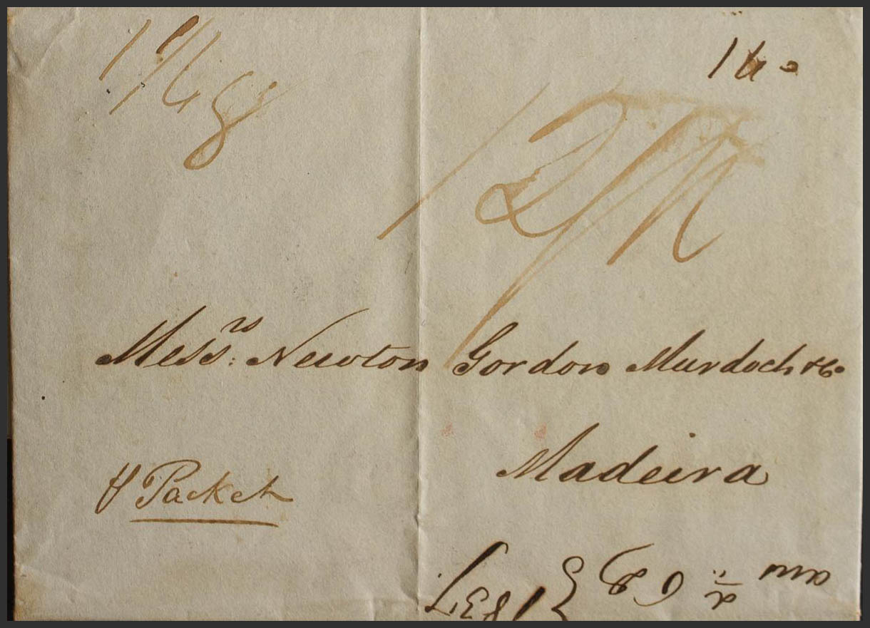 1837. SANTA CRUZ DE TENERIFE a MADEIRA (ISLAS DE PORTUGAL). Transportada privadamente hasta Londres y puesta en el correo el 05-09-1837, la carta es transportada por el packet "Tyrian" que sale de Falmouth el dÃa 11 de septiembre y llega a su destino el 2 de Octubre. MAGNIFICA Y MUY RARO DESTINO DESDE LAS ISLAS CANARIAS.