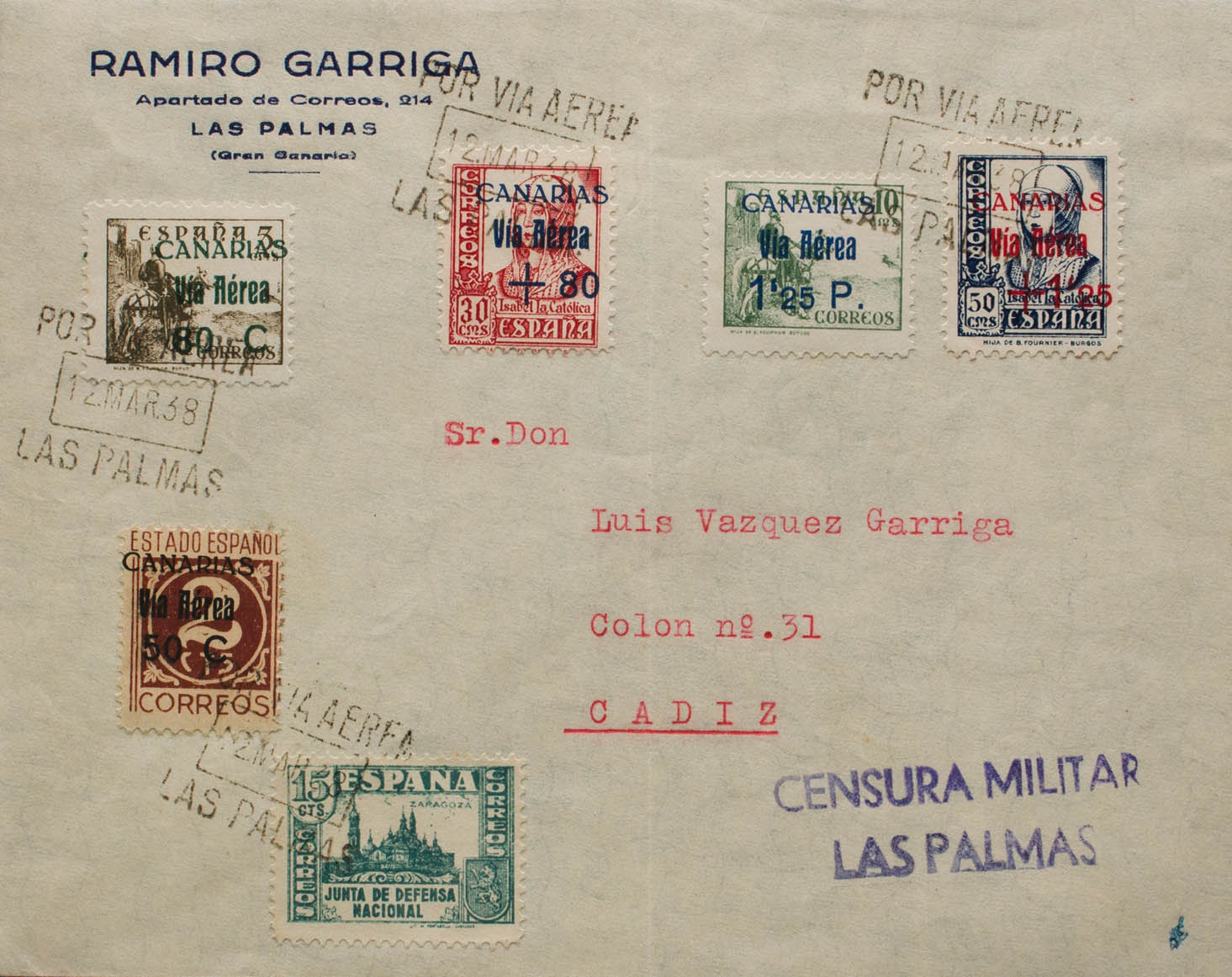 44/46, 50/51. 1938. Diversos valores. Certificado de LAS PALMAS a CADIZ. Al dorso llegada. MAGNIFICA Y RARA.