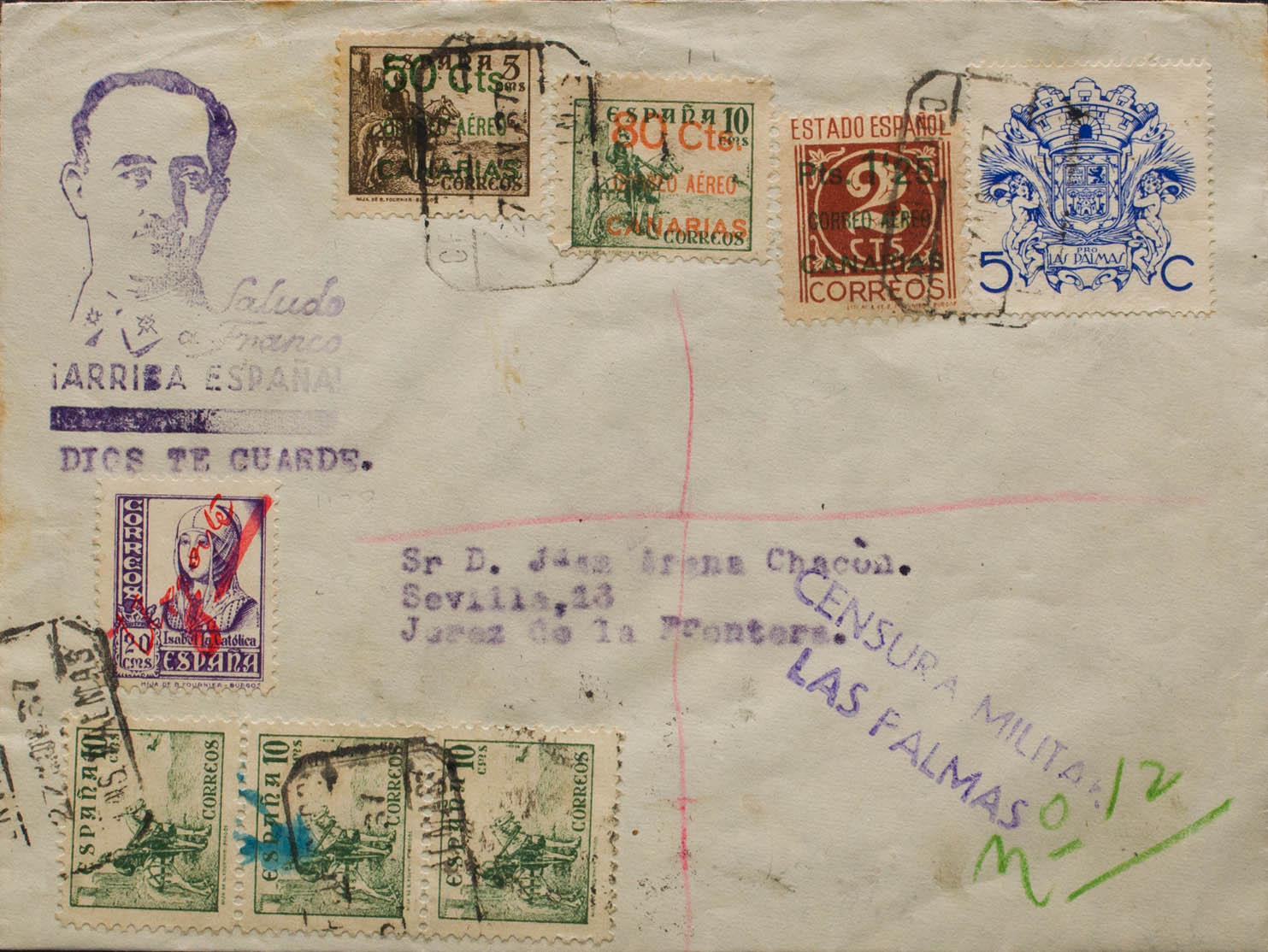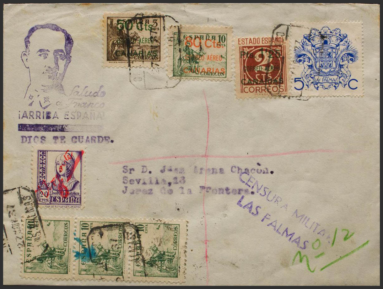 34/36. 1937. Serie completa y diversos valores. Certificado de LAS PALMAS DE GRAN CANARIA a JEREZ DE LA FRONTERA. El sello de 20 cts violeta (Isabel) con anotación manuscrita "Urgente" y llegada al dorso. MAGNIFICA Y RARA.