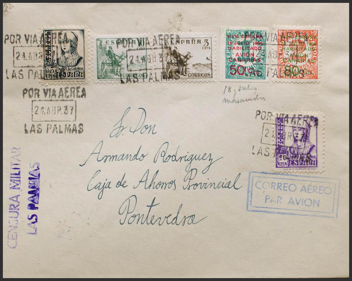 8, 9. 1937. 50 cts sobre 1 cts y 80 cts sobre 2 cts. Correo Aéreo de LAS PALMAS a PONTEVEDRA. Al dorso llegada. MAGNIFICA.
