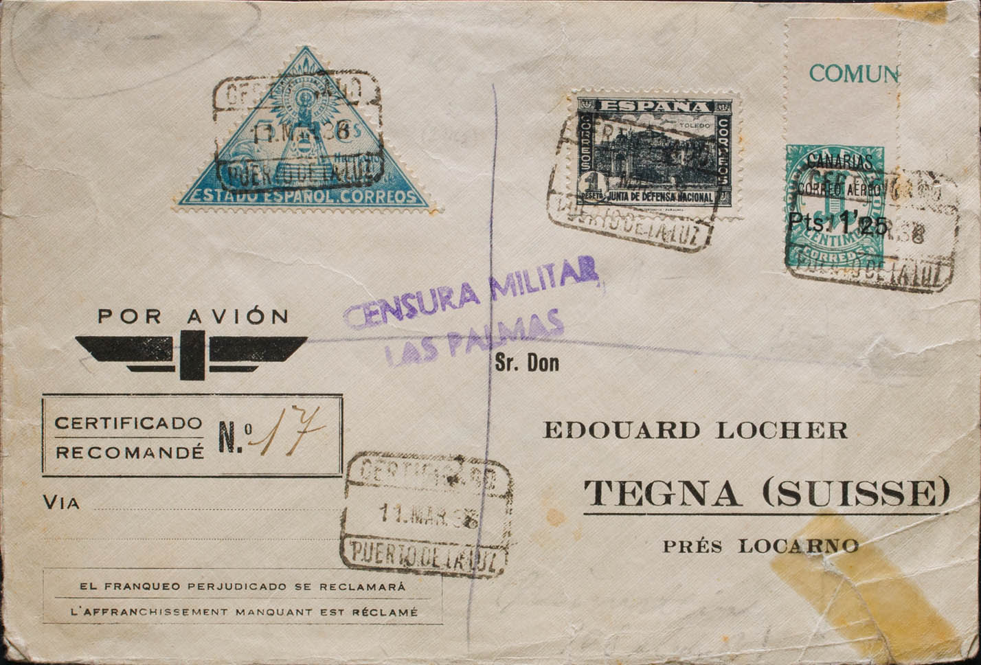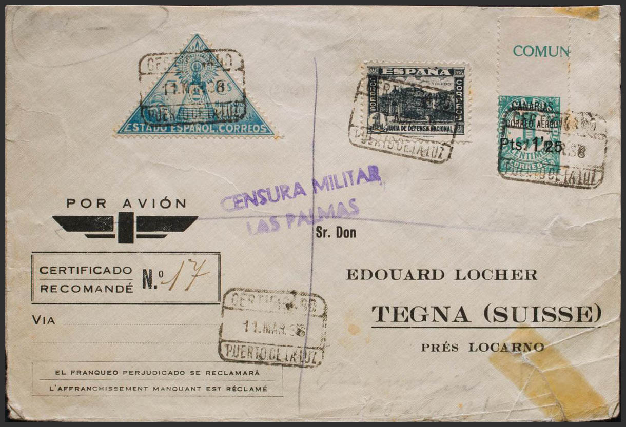 26sma. 1938. 1´25 pts sobre 1 cts variedad SIN DENTAR MARGEN SUPERIOR. Correo Certificado de PUERTO DE LA LUZ a TEGNA (SUIZA). Al dorso llegada. MAGNIFICA Y RARISIMA VARIEDAD EN CARTA.