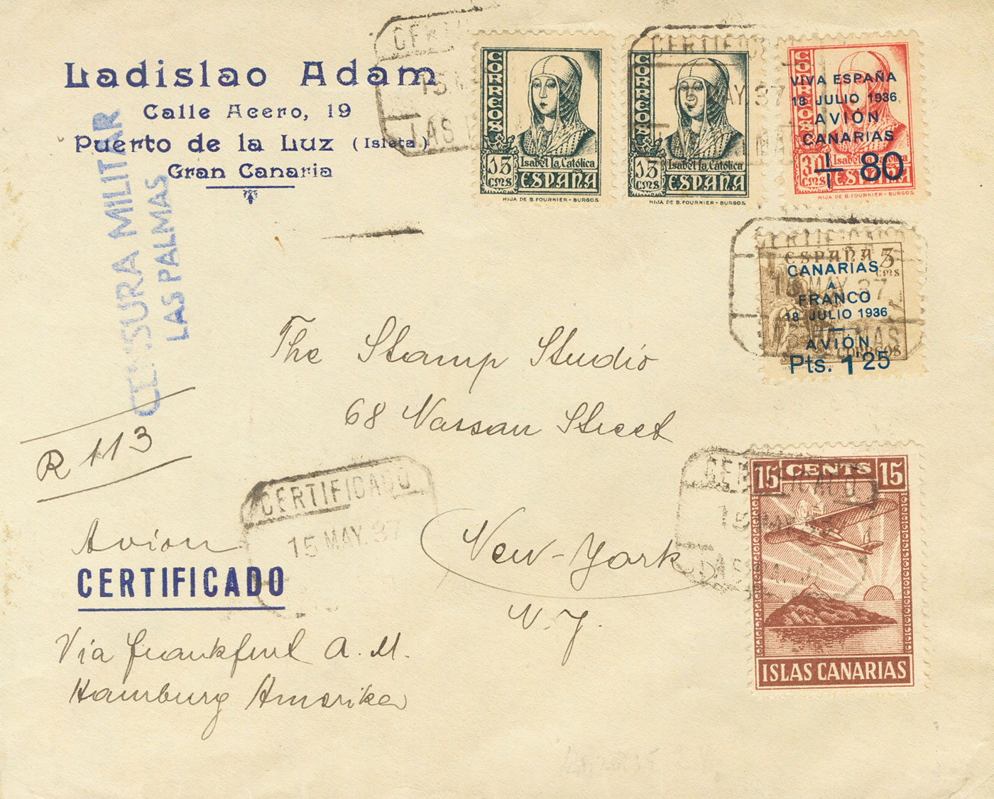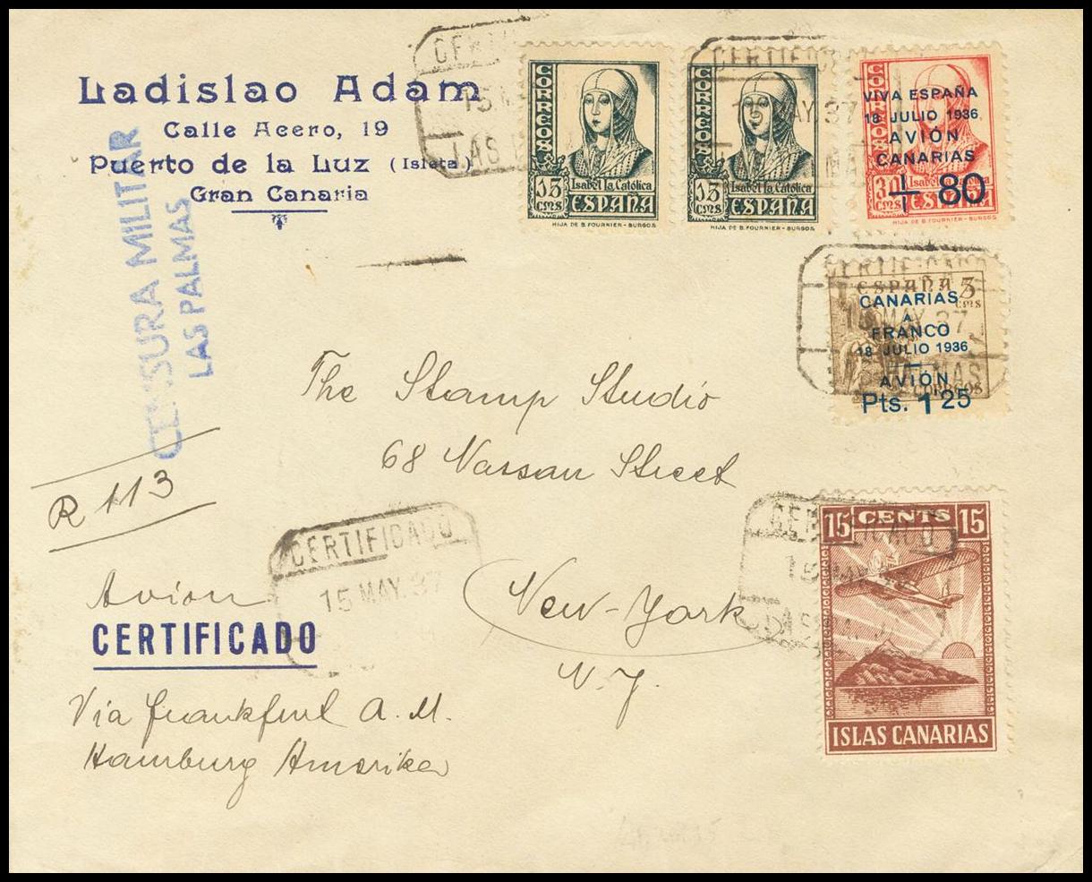 13, 15. 1937. 15 cts, dos sellos, 80 cts sobre 30 cts, 1´25 pts sobre 5 cts y sello local 15 cts. Certificado Aéreo de LAS PALMAS a NUEVA YORK (USA). Al dorso llegada. MAGNIFICA.