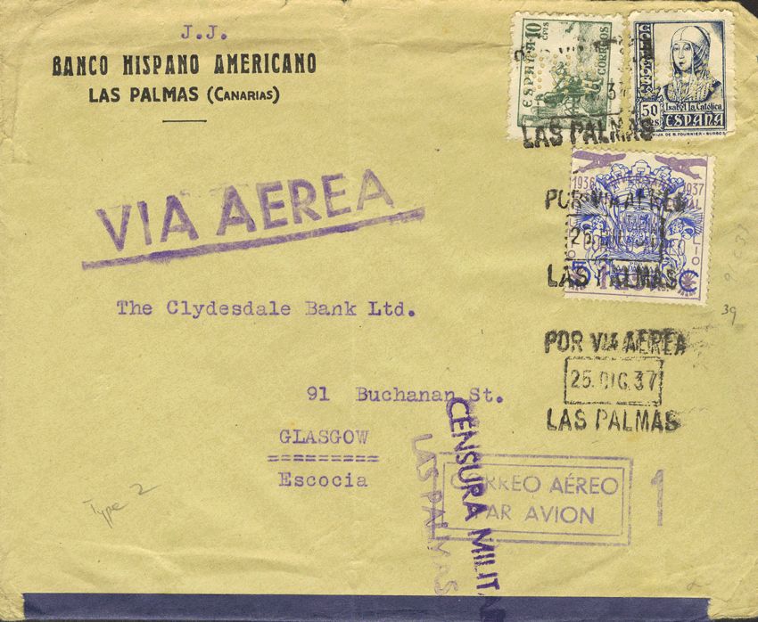 33. 1937. 10 cts y 50 cts, PERFORADOS y 5 cts sobre 1´25 pts. LAS PALMAS a GLASGOW. MAGNIFICA.