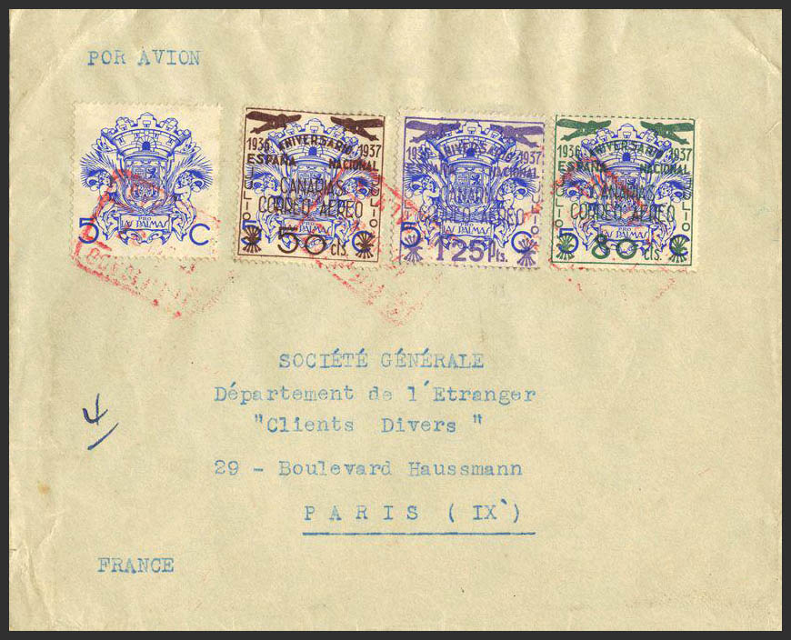 31/33. 1938. Serie completa. LAS PALMAS a PARIS. Matasello LAS PALMAS / CANARIAS, en rojo. Al dorso llegada. MAGNIFICA.