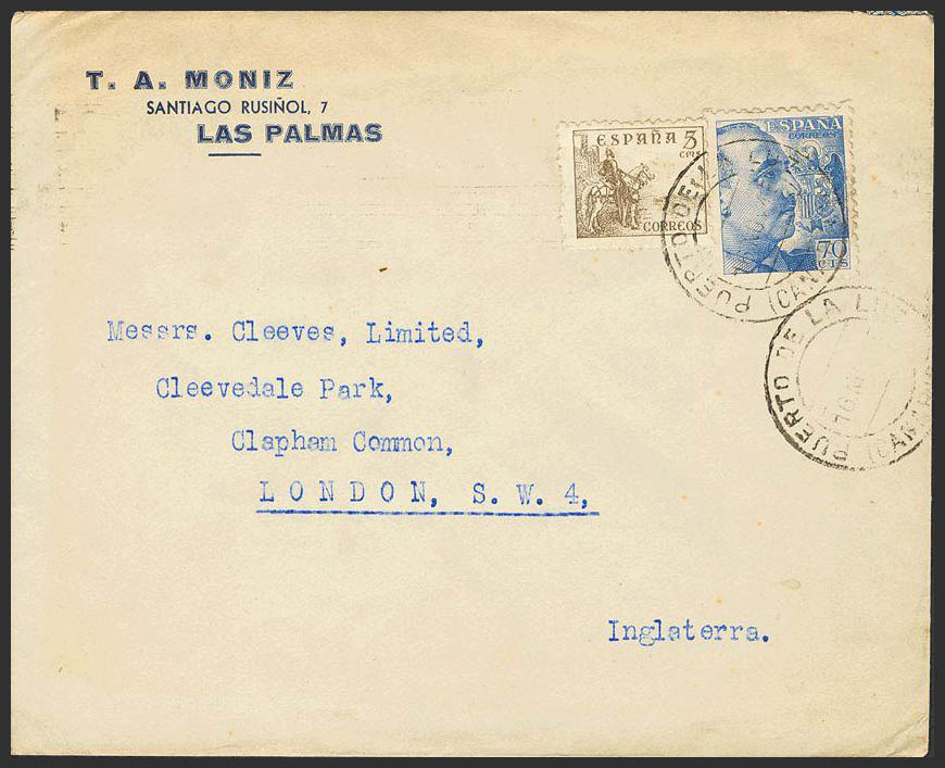 Canarias. Historia Postal. PUERTO DE LA LUZ / CANARIAS, al dorso tránsito. MAGNIFICA.