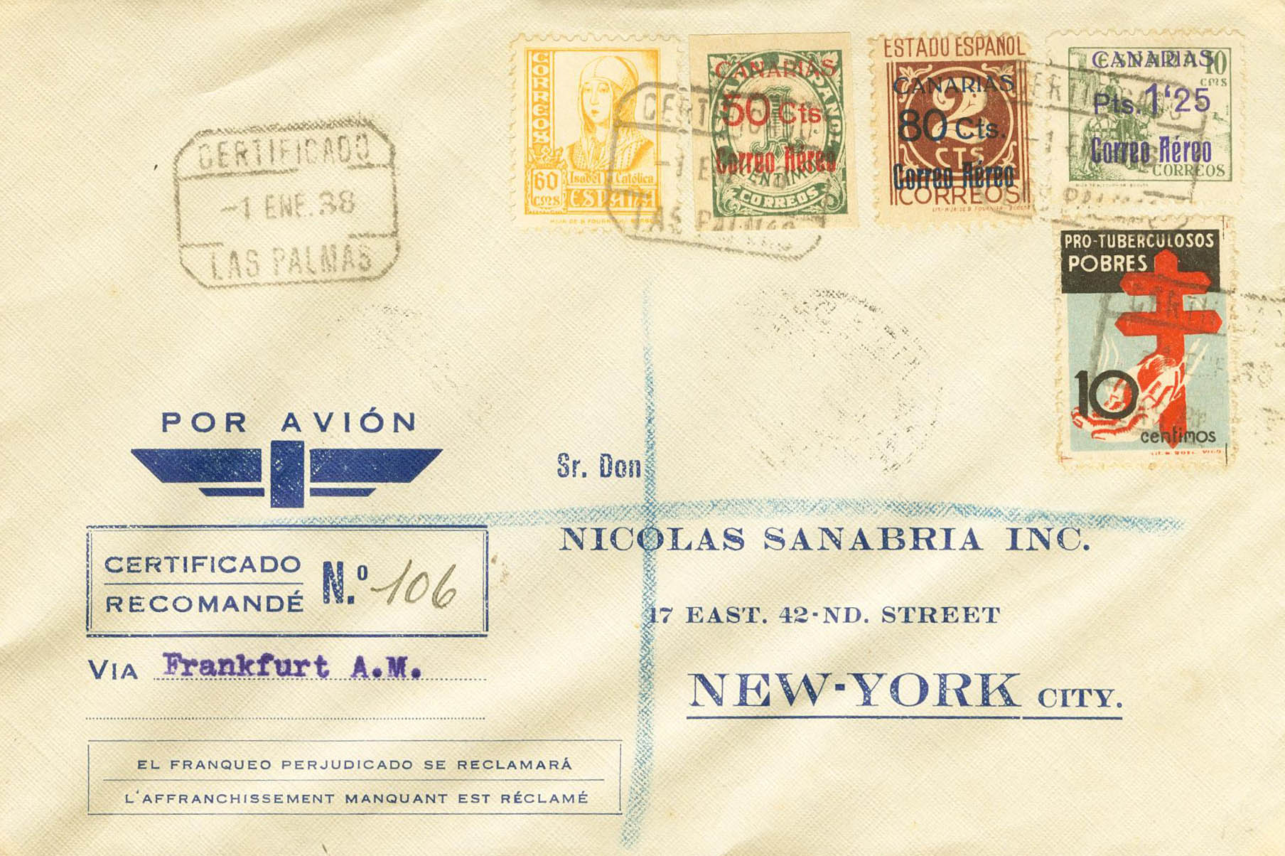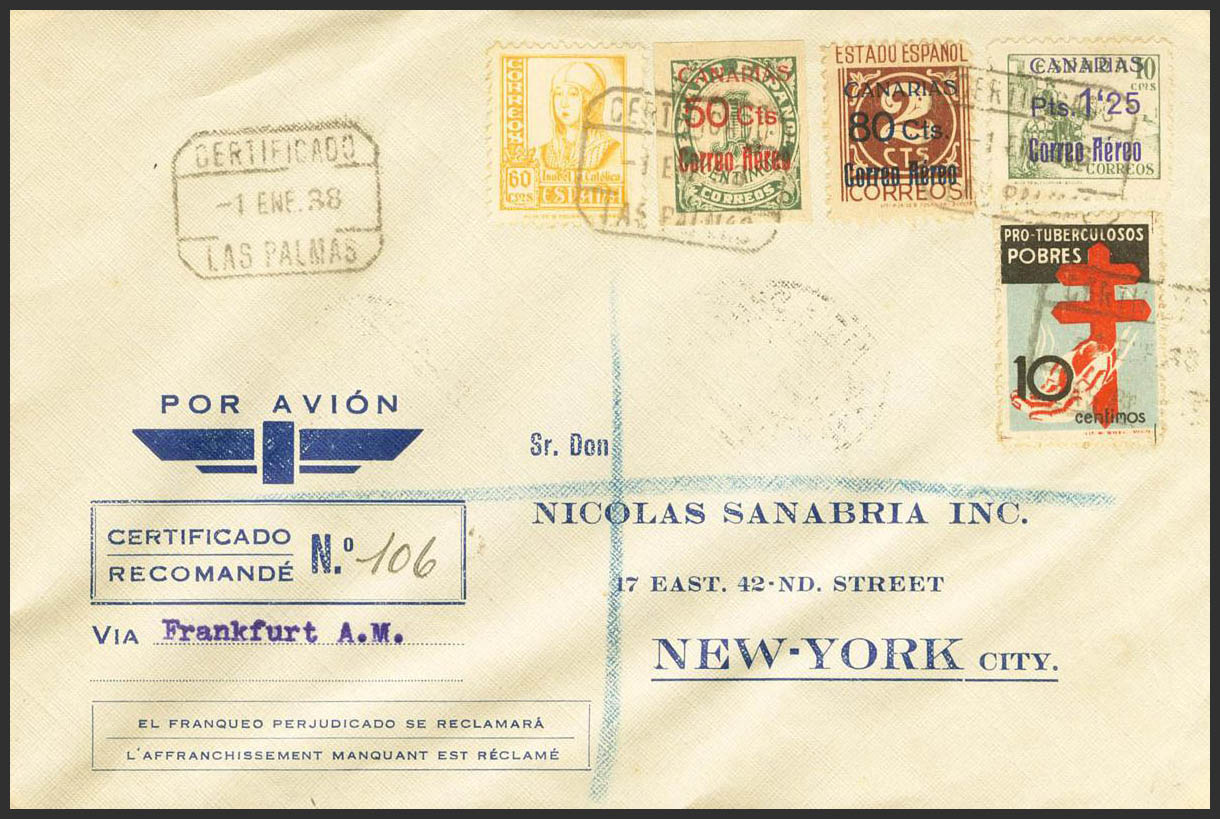 37/39, 826, 840. 1938. Serie completa. LAS PALMAS a NUEVA YORK (USA). Al dorso llegada. MAGNIFICA Y RARA.