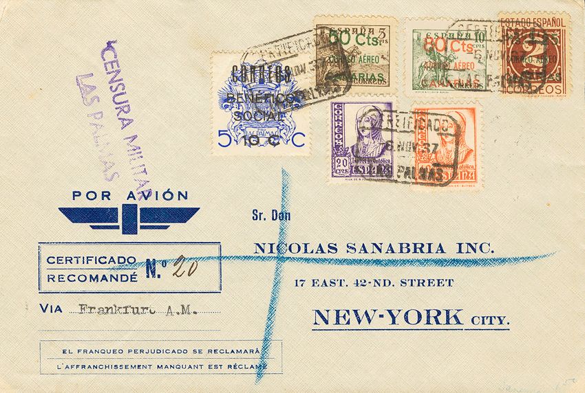 34/36. 1937. Serie completa. Certificado de LAS PALMAS a NUEVA YORK (USA). Al dorso llegada. MAGNIFICA.