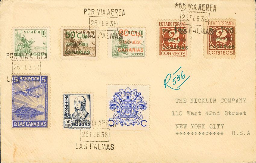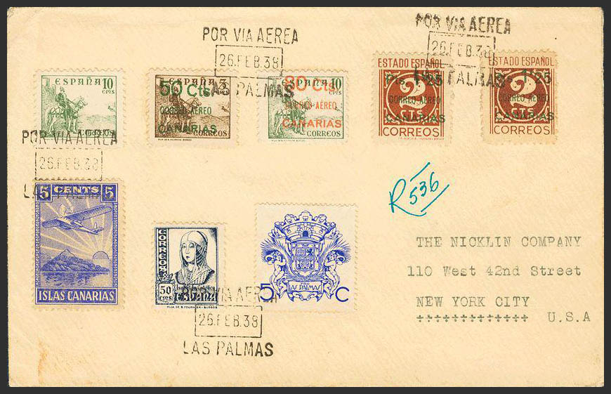 34/36. 1937. Serie completa. LAS PALMAS a NUEVA YORK (USA). Al dorso llegada. MAGNIFICA.