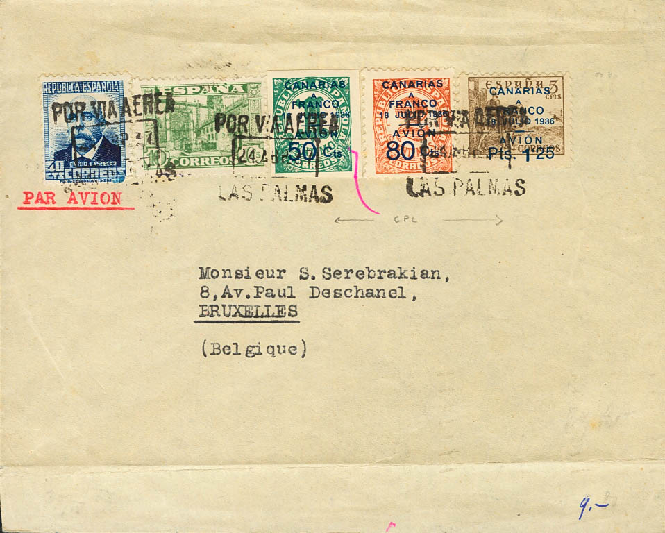 11/13, 670, 805. 1937. Serie completa, 40 cts azul y 10 cts verde. LAS PALMAS a BRUSELAS (BELGICA). Al dorso llegada. MAGNIFICA.