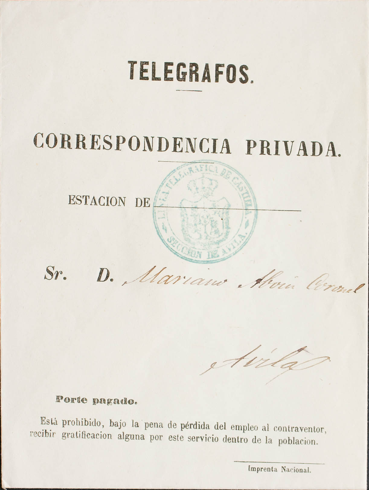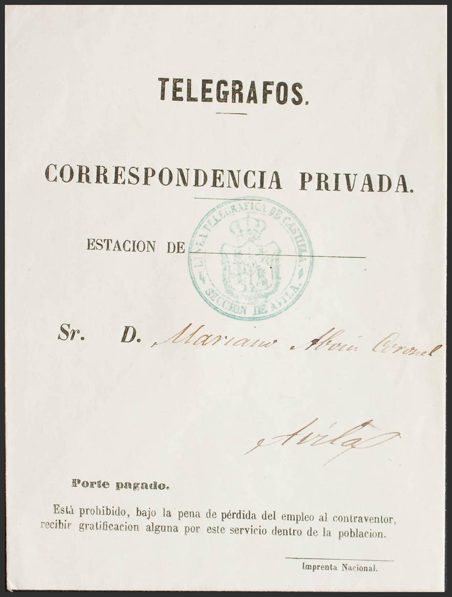 1862. Sobre Telegrama dirigido a AVILA. En el frente marca LINEA TELEGRAFICA DE CASTILLA / SECCION DE AVILA, en azul. MAGNIFICO Y RARO.