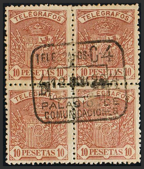 62(4). 1921. 10 pts castaño, bloque de cuatro. Matasello TELEGRAFOS C-4 / PALACIO DE COMUNICACIONES. MAGNIFICO.