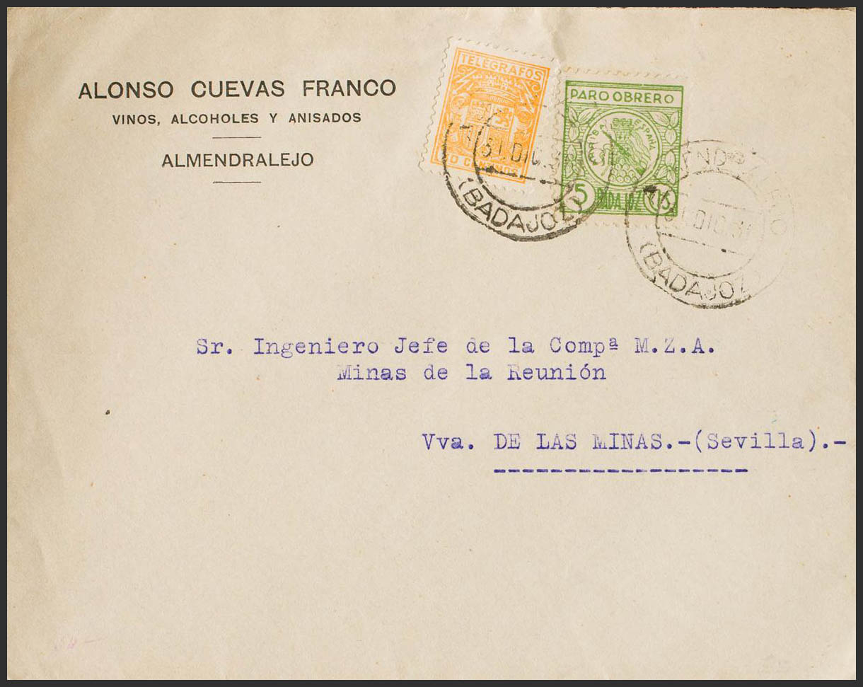 71. 1936. 30 cts naranja y Benéfico de 5 cts verde PARO OBRERO. ALMENDRALEJO a VILLANUEVA DE LAS MINAS. Al dorso llegada. MAGNIFICA Y RARA CIRCULADA CON UN SELLO DE TELEGRAFOS.
